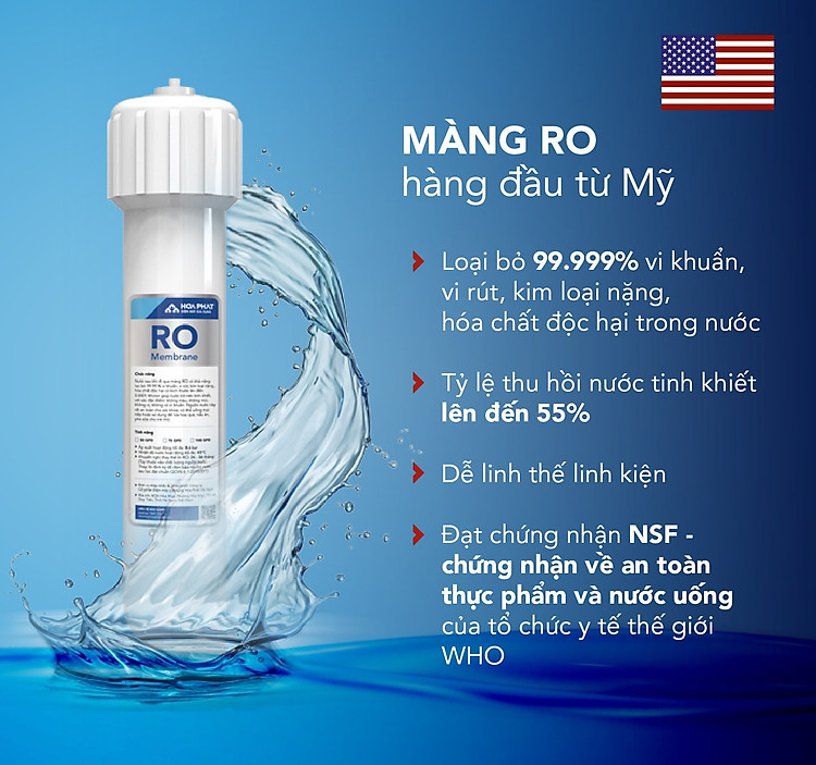 - Màng lọc RO Dupont Filmtec hàng đầu từ Mỹ giúp loại bỏ 99.99% vi khuẩn, vi rút, kim loại nặng, hóa chất độc hại trong nước;