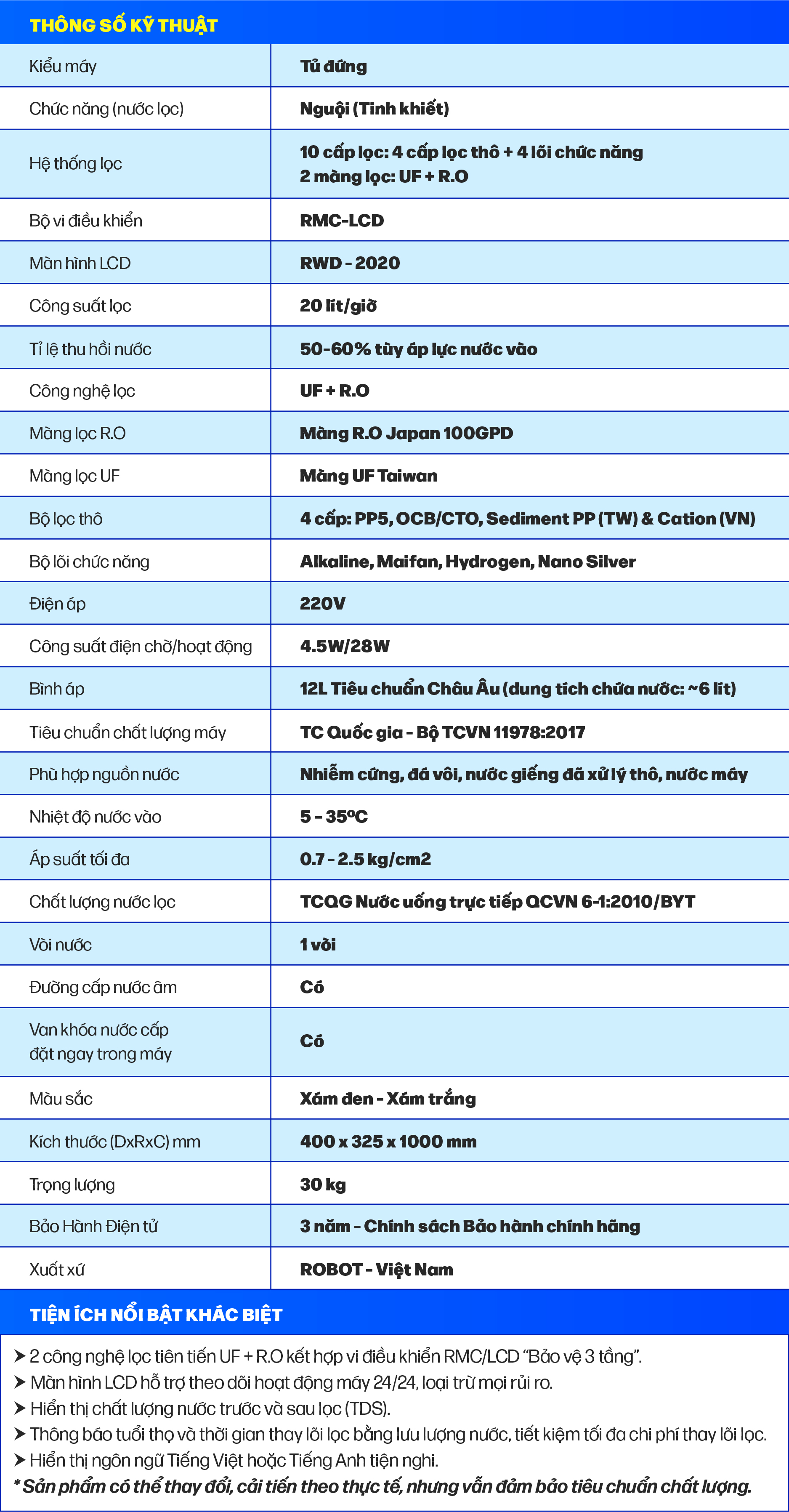 - Các sản phẩm máy lọc nước ROBOT đều sở hữu màn hình LCD sắc nét, hiển thị chi tiết các thông số TDS – chất lượng nước trước & sau lọc, tuổi thọ lõi lọc 24/24… để mọi người đều dễ dàng theo dõi hoạt động máy, chất lượng nước uống thông qua màn hình LCD, loại trừ mọi rủi ro, mang đến sự an toàn tuyệt đối khi sử dụng.