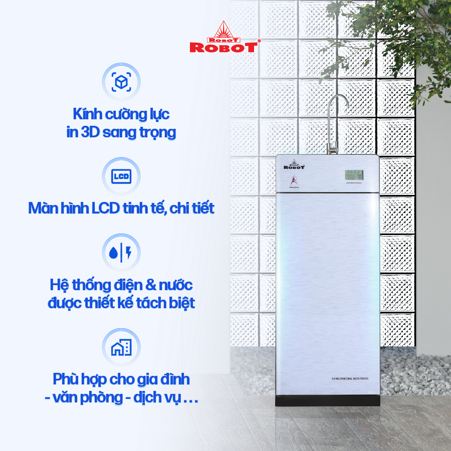 - Máy lọc nước ROBOT LUX PRO 2410W-UR, được thiết kế hiện đại, sang trọng, thân tủ sơn tỉnh điện cao cấp chống trầy, nắp trên & mặt trước sử dụng kính cường lực in UV, 3D, tích hợp màn hình LCD được đặt trực tiếp trên thân máy, dễ dàng quan sát và theo dõi chất lượng nước lọc. Kích thước máy nhỏ gọn tối ưu, không chiếm diện tích, phù hợp mọi không gian lắp đặt.