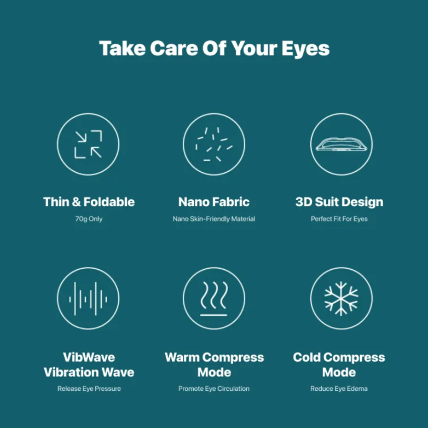 - Kiểm soát nhiệt độ thông minh, với một lớp lót bằng vải Nano mềm mại, chống bụi, tránh mùi hôi thân thiện với da, phù hợp cho mắt của bạn. Chườm nóng 45℃, thúc đẩy tuần hoàn mắt và giảm mỏi mắt làm giảm nhức mỏi, áp lực và tăng tốc độ lưu thông máu ở vùng mắt. Chườm lạnh giảm phù nề mắt giúp bạn đánh tan các quầng thâm nếu sử dụng đều đặn 15 phút mỗi ngày.