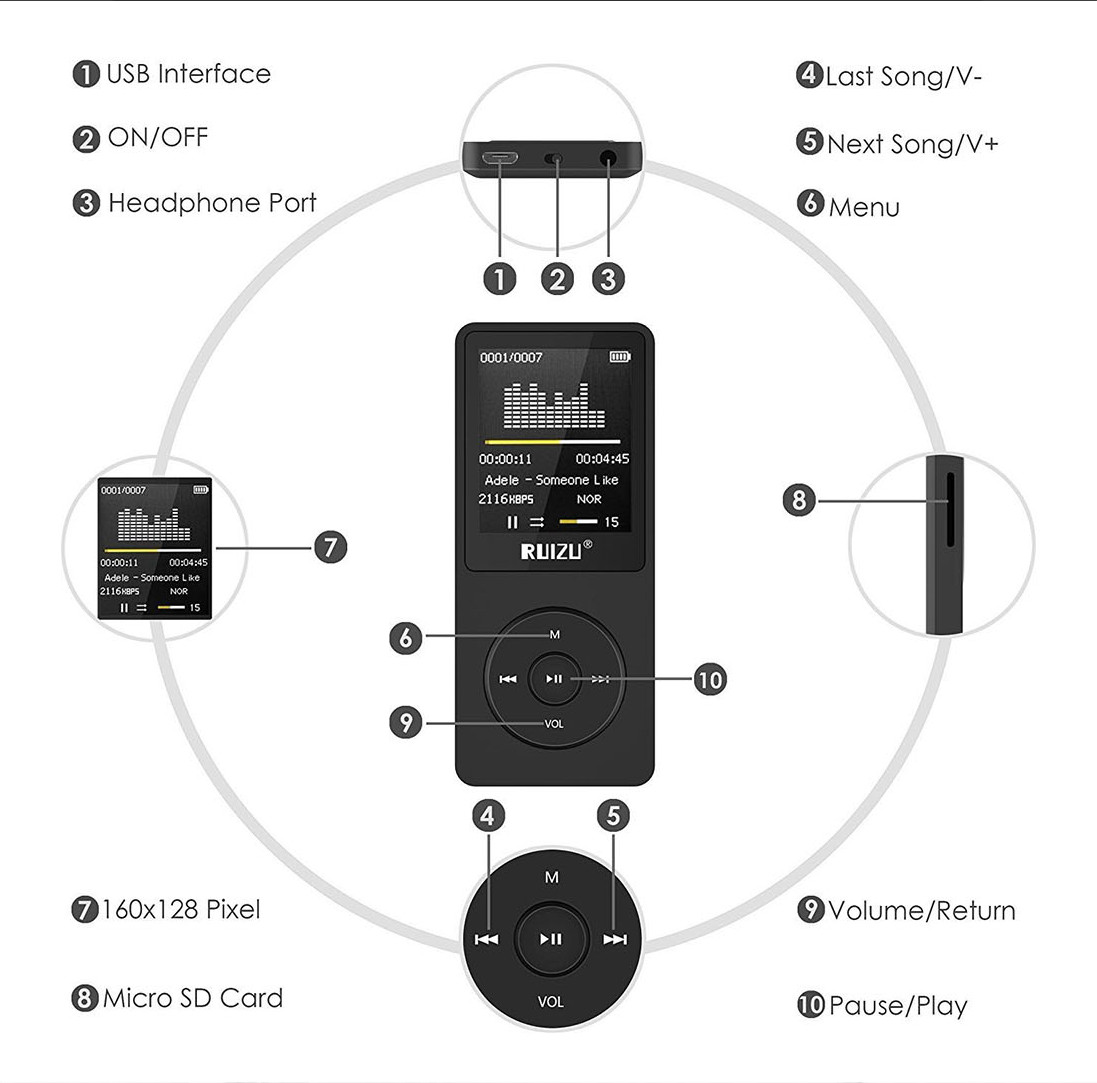 - Máy nghe nhạc RUIZU D19 thiết kế nhỏ gọn, kiểu dáng thể thao, màn hình màu TFT 2,4 inch cảm ứng mang lại hình ảnh sắc nét, kết nối bluetooth 5.0 ổn định trong phạm vi