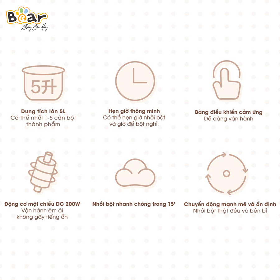 - Thích hợp cho người mới làm bánh, yêu làm bánh; phù hợp sử dụng cho gia đình nhỏ Thông số kỹ thuật Hãng: Bear Model: DM-B05V1 (HMJ-A50B1) Dung tích: 5 Lít Công suất: 200W Điện áp: 220V ~ 50Hz Chất liệu: ABS, Inox 304, Hợp kim nhôm Kích thước: 296×262×293mm Công dụng Trộn và ủ bột tự động Trộn bột đa góc, tạo nên khối bột đều, đạt tới độ mềm dẻo đúng kỹ thuật trong 15 phút Ủ bột tự động giúp thớ bột dai, kéo màng đạt chuẩn Hướng dẫn sử dụng Bạn dễ dàng sử dụng máy tộn bột 5L Bear chỉ với 5 thao tác dưới đây: