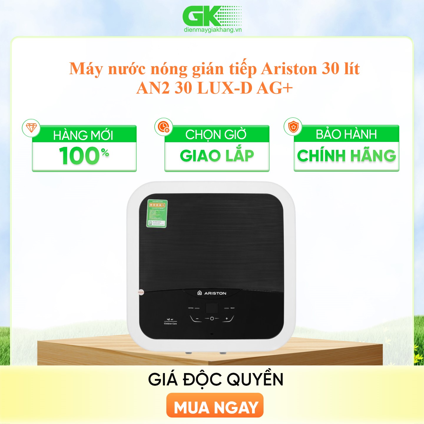 Máy nước nóng gián tiếp 30 lít Ariston AN2 30 LUX-D AG+ thiết kế sang trọng, bình chứa nước lớn 30 lít, làm nóng nước nhanh với công suất 2500W, thanh đốt 100% bằng đồng, bảo