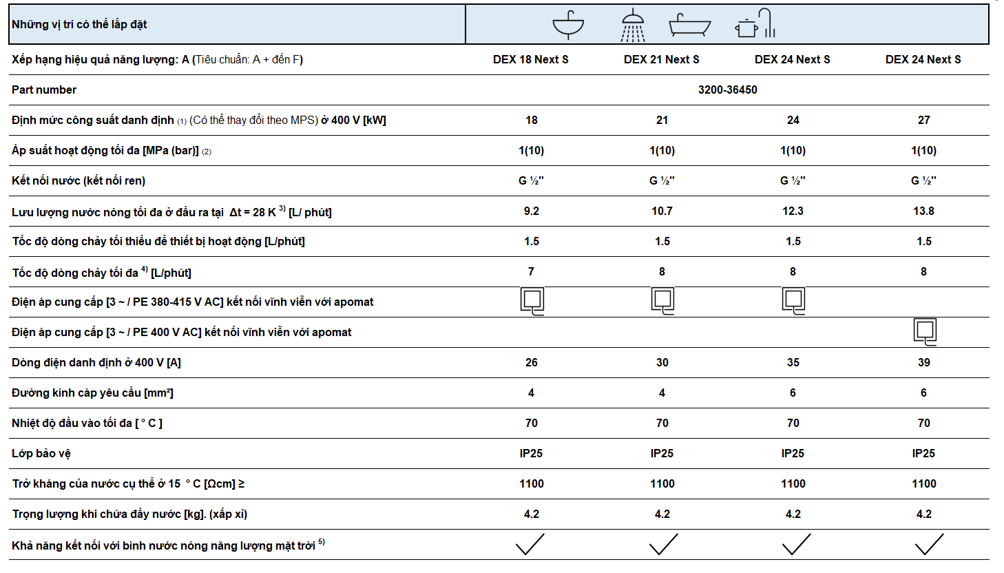 Máy nước nóng tức thì E-Comfort DEX Next S. DEX Next là sản phẩm bán chạy nhất hiện được trang bị khả năng kiểm soát tốc độ dòng chảy tự động với SERVOTRONIC thế hệ “S” mới nhất. Do đó đảm bảo nước luôn nóng ở nhiệt độ mong muốn. > Máy nước nóng tức thì được điều khiển hoàn toàn bằng điện tử với màn hình e-paper và các phím bấm cảm ứng để mang lại sự thoải mái khi vận hành. > Nhiệt độ luôn chính xác từ 20°C đến 60°C nhờ công nghệ kiểm soát NHIỆT ĐỘ TWIN TTC và kiểm soát tốc độ dòng chảy động SERVOTRONIC. > Thích hợp cho các vòi tiết kiệm nước do lưu lượng nước cần thiết để thiết bị hoạt động đặc biệt thấp chỉ từ 1,5 L/phút nhờ công nghệ kiểm soát dòng nước tiên tiến. > Chức năng xử lý nhiệt ở 70°C để đảm bảo vệ sinh. > Chức năng tự động làm đầy bồn tắm theo lượng nước và có thể điều chỉnh (theo lít) đồng thời có chức năng hẹn giờ riêng biệt Thiết kế hấp dẫn Màn hình cảm ứng được tích hợp giúp thiết bị giống như một sản phẩm décor cao cấp trong mọi phòng tắm hiện đại. Nhờ thiết kế phẳng, thiết bị cũng có thể dễ dàng lắp đặt cả ở những vị trí nhỏ và khuất mà không ảnh hưởng đến không gian cho các thiết bị khác. Công nghệ hiện đại giúp ngay lập tức có nhiệt độ nước mong muốn chỉ 2 giây sau khi mở van nước Có ngay nhiệt độ nước mong muốn mà không cần thiết pha thêm nước lạnh. Công suất thiết bị được điều khiển điện tử với công nghệ TWIN TEMPERATURE Control TTC đảm bảo kiểm soát nhiệt độ chính xác đến 0.5°C ngay cả khi áp suất nước đầu vào không ổn định. Công nghệ SERVOTRONIC giúp kiểm soát tốc độ dòng chảy động, tự động điều chỉnh giảm tốc độ dòng chảy khi đạt đến giới hạn công suất. Bảo vệ an toàn – Hoạt động bền bỉ Hệ thống an toàn điện tử với khả năng phát hiện bọt khí trong đường ống giúp tăng độ an toàn và tuổi thọ của thiết bị. E-comfort instant water heater 23.9 cm Định mức công suất linh hoạt Với Hệ thống MPS giúp thiết bị có khả năng tích hợp được nhiều nguồn điện, định mức công suất tối đa được thiết lập tại thời điểm lắp đặt : 18, 21, 24 hoặc 27 kW. Màn hình LCD kết hợp phím bấm cảm ứng giúp dễ dàng kiểm soát Tiếp cận với việc kiểm soát đơn giản đối với các thiết bị sử dụng cho cá nhân giúp tiết kiệm tài nguyên và năng lượng. Màn hình cảm ứng tích hợp ở phía trước kết hợp các phím điều khiển cảm ứng cho phép thiết lập hồ sơ từng cá nhân người dùng, xác định mục tiêu tiết kiệm, thiết lập nhu cầu cá nhân và dữ liệu tiêu dùng có thể kiểm tra lại để có cái nhìn tổng quan hơn về chi phí. Tùy chọn: Thiết bị có thể được vận hành với tối đa ba điều khiển từ xa Bluetooth FX 3, hai điều khiển từ xa FX Next hoặc thông qua ứng dụng “Smart Control”. Ít cặn vôi hơn Hệ thống làm nóng nước sử dụng dây trần IES làm giảm cặn vôi hiệu quả giúp thiết bị kéo dài tuổi thọ cũng như bảo trì, bảo dưỡng dễ dàng. Nước được làm nóng chỉ vài giây sau khi mở vòi.   Phụ kiện đi kèm RDX 3 Khung lắp đa năng cho DSX Touch, DFX Next, DEX Next S, DEX Next, DCX Next, DLX Next và DBX Next với bộ dây điện và phần mở rộng kết nối bằng đồng thau cho các bộ lắp đặt đặc biệt, ví dụ: kết nối điện tại bất kỳ điểm nào phía sau thiết bị. RDX3: Part no. 3200-36100 Thông số kỹ thuật Ghi chú: