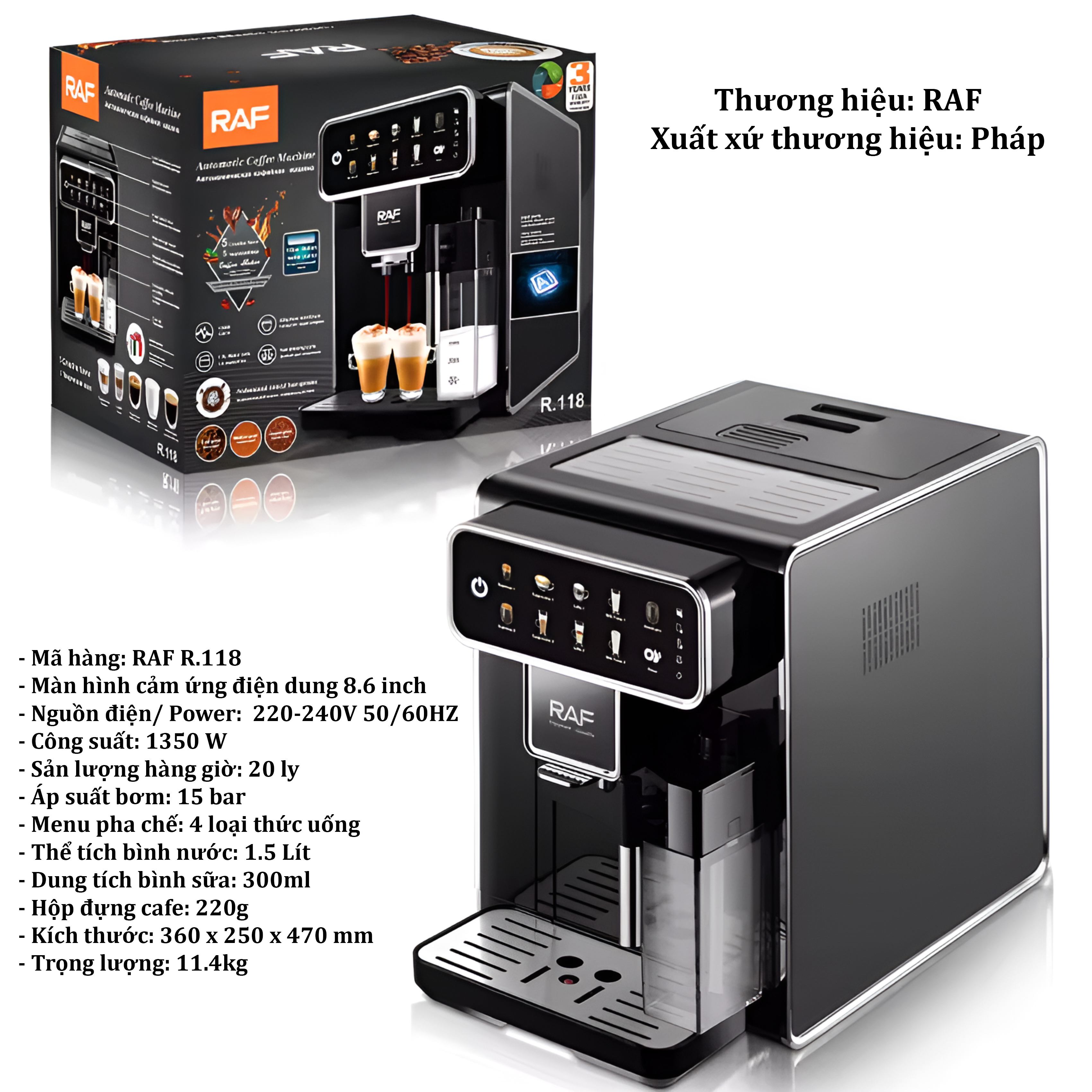 ✨Máy Pha Cà Phê Tự Động RAF R.118 Thương Hiệu Pháp Màn Hình Cảm Ứng 8.6 Inch, Công Suất 1350W, 1 Giờ 20 Ly - HÀNG NHẬP KHẨU, BẢO HÀNH 1 NĂM
