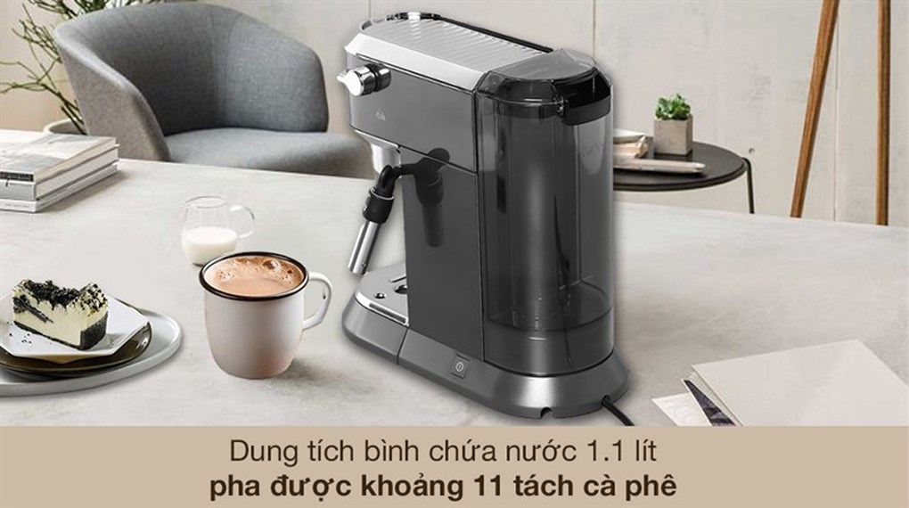 Thiết kế máy pha cà phê Delonghi nhỏ gọn, bắt mắt với màu xám thạch anh, tạo điểm nhấn cho không gian sống của gia đình, văn phòng
