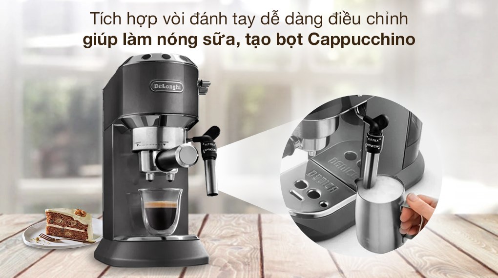 Tích hợp hệ thống Cappuccino - vòi đánh sữa dễ dàng điều chỉnh để chuẩn bị sữa nóng, bọt sữa cho Cappuccino, lấy nước nóng để pha trà hoặc làm ấm ly tách, Giúp bạn pha chế 1 tách capuccino hoàn hảo hay các thức uống ngon miệng khác.