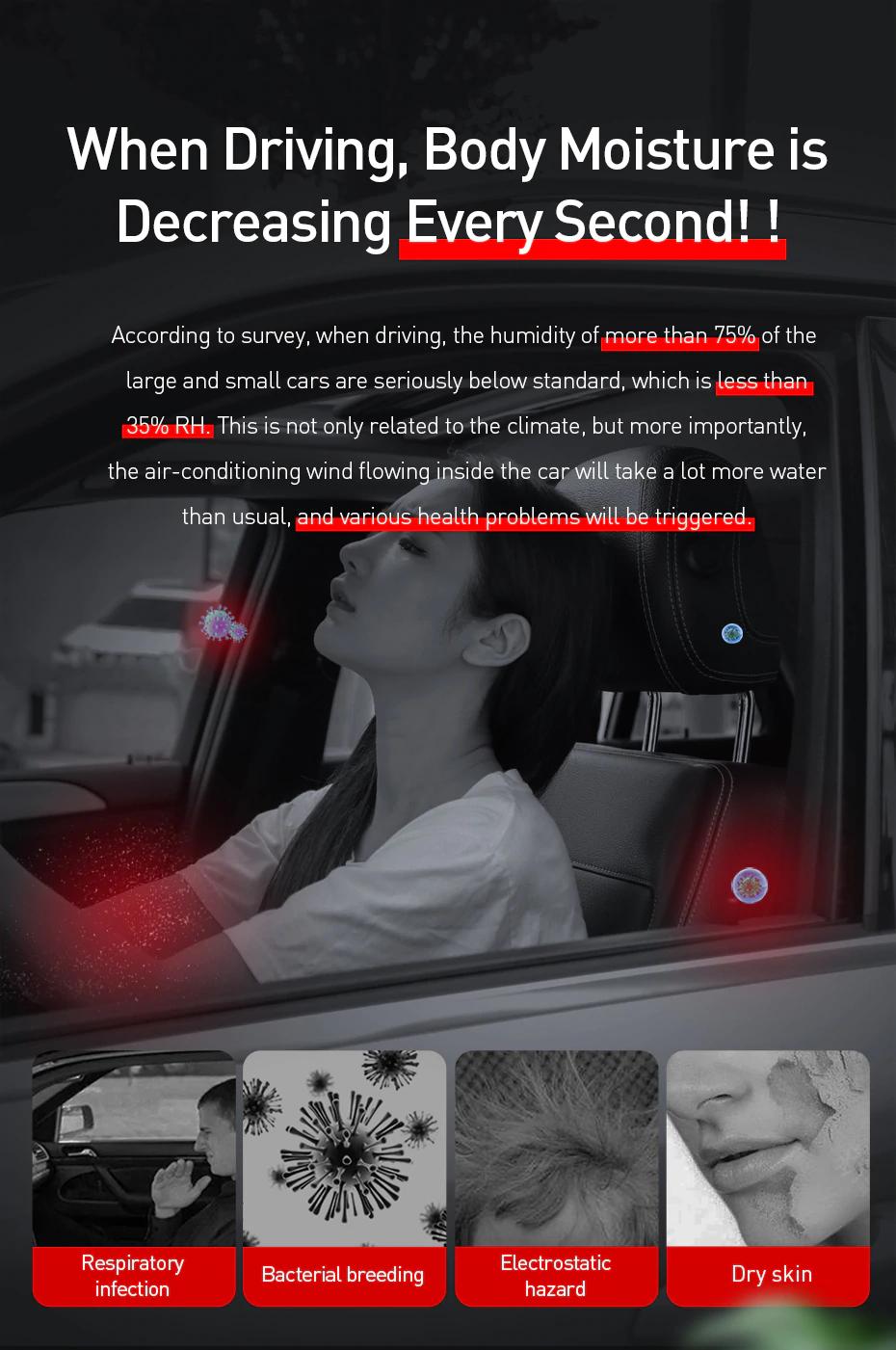- Có tác dụng giảm căng thẳng mệt mỏi , làm đẹp da , giúp dễ ngủ, cải thiện sức khỏe và xua đuổi các loại côn trùng gây hại . Đặc biệt không làm ướt xe, không có sương mù trên kính lái làm tăng độ ẩm trong xe lên đến 40% đồng thời lượng phun lên tới 45ml / h, có thể tăng cường hoàn toàn độ ẩm không khí bên trong xe trong thời gian ngắn, giữ ẩm không khí và bảo vệ nội thất da tốt hơn