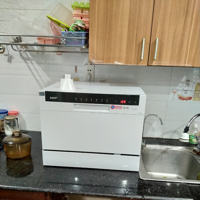 MÁY RỬA BÁT KAFF KF-W8001EU 6 BỘ MÀU TRẮNG - NHẬP KHẨU NGUYÊN CHIẾC TỪ CHLB ĐỨC   Hiện nay, có rất nhiều thương hiệu máy rửa bát trên thị trường. Trong đó Máy rửa bát Kaff KF-W8001EU được người dùng yêu thích và tin dùng nhiều nhất. Đây là loại máy rửa bát mini cho phép người dùng rửa tối đa 6 bộ bát đĩa Châu Âu. Loại máy này do thương hiệu Kaff cung cấp và phân phối, sử dụng linh kiện chính hãng, đạt tiêu chuẩn năng lượng Châu Âu A++, cho chất lượng máy vượt trội.   So với các loại máy rửa bát mini thông thường khác, loại Máy rửa bát Kaff KF-W8001EU của Kaff có nhiều ưu điểm vượt trội hơn, cho phép rửa được cả xoong nồi chảo mini. Dòng máy này rất thích hợp cho các gia đình ít người, từ 2-4 thành viên hoặc hộ gia đình có nhu cầu sử dụng ít.   ĐẶC ĐIỂM CƠ BẢN MÁY RỬA BÁT KAFF KF-W8001EU   Tổng quan thiết kế bên ngoài   Máy rửa bát Kaff KF-W8001EU có thiết kế hình chữ nhật ngang, có kích cỡ R550 x S500 x C438 mm. Nhìn bề ngoài, máy có hình dạng như một chiếc tủ lạnh mini, khá nhỏ gọn và tiện ích, dễ dàng di chuyển tới nhiều vị trí khác nhau trong căn bếp gia đình.   Máy rửa bát Kaff KF-W8001EU được thiết kế dạng độc lập, tách rời. Người dùng có thể linh hoạt đặt trên mặt bàn hoặc lắp âm tủ trong cánh tủ đều được. Tuy nhiên, nếu muốn lắp đặt âm thì cần phải đảm bảo diện tích khoang tủ lớn hơn kích cỡ của máy, để dễ dàng sử dụng và vệ sinh.   Máy rửa bát Kaff KF-W8001EU có nhiều điểm ấn tượng, độc đáo và mới lạ hơn so với nhiều loại máy rửa bát thông thường. Chất liệu của máy là thép không gỉ, bền chắc, toàn thể máy sử dụng tông màu trắng inox sạch, đẹp tạo cảm giác sang trọng, hiện đại và mát mẻ.   Mặt trước   Máy rửa bát Kaff KF-W8001EU có phần tay vịn màu xám, bên trong là khoảng trống hở để người dùng dễ dàng nắm được và kéo ra khi cần. Trên thanh tay vịn là bảng điều khiển của máy, chứa các phím bấm hiện đại, mỗi phím bấm đều có biểu tượng đi kèm và cụm từ tiếng anh tương ứng. Nếu người dùng chưa quen với việc sử dụng tiếng anh, khi mua máy rửa bát sẽ đi kèm sách hướng dẫn sử dụng để giới thiệu chi tiết các tính năng của máy. Tên thương hiệu được hiển thị ở góc trái của màn hình hiển thị. Dưới cùng là phần đáy được ngăn cách với phần thân bởi 1 đường khe hở khoảng 1-2cm.   Mặt đáy   Máy rửa bát Kaff KF-W8001EU có mặt đáy bằng phẳng như nhiều loại máy khác. Mặt đáy của máy có 4 trụ màu trắng, tiếp xúc trực tiếp với sàn đất, làm bệ đỡ chính cho trọng lượng của máy. 4 trụ ở 4 góc đều được làm từ chất liệu thép không gỉ nên khả năng chịu lực tốt, chịu nhiệt và tính thích ứng với môi trường cao, không lo về vấn đề han gỉ, ẩm mốc.   Mặt đằng sau   Mặt đằng sau sẽ toàn bộ khung màu bạc, chứa ống thoát nước dài 158cm và ống cấp nước dài 154cm. Ngoài ra còn hệ thống dây điện dài 149cm. Tất cả những vật dụng liên quan đến dây điện, ống dẫn nước được sắp xếp ở mặt sau để tiết kiệm diện tích và đảm bảo tính thẩm mỹ cho Máy rửa bát Kaff KF-W8001EU.   Thiết kế bên trong   Máy rửa bát Kaff KF-W8001EU có 1 khay rửa di động hay còn gọi là 1 giá rửa bát đĩa. Các loại dĩa thìa, người dùng có thể cho vào vào hộp màu xám ở trong khay rửa dưới hoặc xếp làm ngang, sao cho các không có bất cứ vật dụng nào cản trở vào tay quay gạt nước của máy.   Ở phía trong bên của Máy rửa bát Kaff KF-W8001EU có chứa ngăn chứa muối và ngăn chứa các chất rác trong quá trình rửa. Người dùng cần dùng loại muối chuyên dụng cho máy rửa bát. Mỗi lần đổ muối sẽ dùng được khoảng 1,5 tháng - 2 tháng. Khi hết lượng muối cần thiết, máy sẽ báo hiệu ở trên bảng điều khiển.   Bên cạnh đó, phần cánh cửa đóng mở có ngăn đựng chất làm bóng và ngăn đựng viên tẩy rửa. Chất làm bóng giúp cho bát đĩa được sáng và bóng hơn, trong khi đó viên tẩy rửa là chất liệu quan trọng để đánh sạch mọi vết bẩn.   Các tính năng và chương trình rửa của máy rửa bát Kaff KF-W8001EU   Máy rửa bát Kaff KF-W8001EU có công suất tiêu thụ từ 1.050kWh/ lần rửa, lượng nước tiêu thụ khoảng 6 lít/1 lần rửa, cho phép rửa 6 bộ bát đĩa Châu Âu tương đương với 2 bữa ăn Việt (gia đình 2-4 thành viên).   Máy có 7 chương trình rửa cơ bản   Chế độ rửa chuyên sâu - Intensive: Chương trình dùng khi cần phải rửa các loại bát đĩa có độ bẩn cao, các vết bẩn bám cáu đặc lên bát. Kích hoạt chế độ này, máy sẽ tự động điều chỉnh lượng nước và tốc độ phun mạnh hơn nhiều lần. Với mức nhiệt độ này sẽ làm sạch bong mọi vết bẩn, đem lại vẻ sáng bóng cho bát đĩa.   Chế độ rửa bình thường - Normal: Chương trình này được nhiều người thường dùng bởi là chương trình rửa căn bản và thích hợp sử dụng rửa chén đĩa cho các bữa ăn hằng ngày.   Chế độ rửa tiết ki