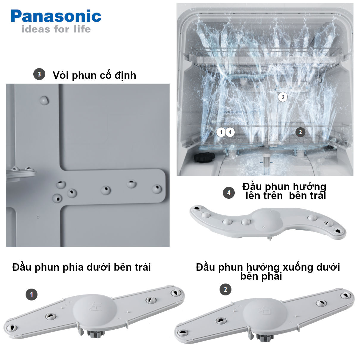 Đầu phun phía dưới bên trái : Vị trí dành riêng cho các loại bát sâu như bát ăn cơm, bát tô