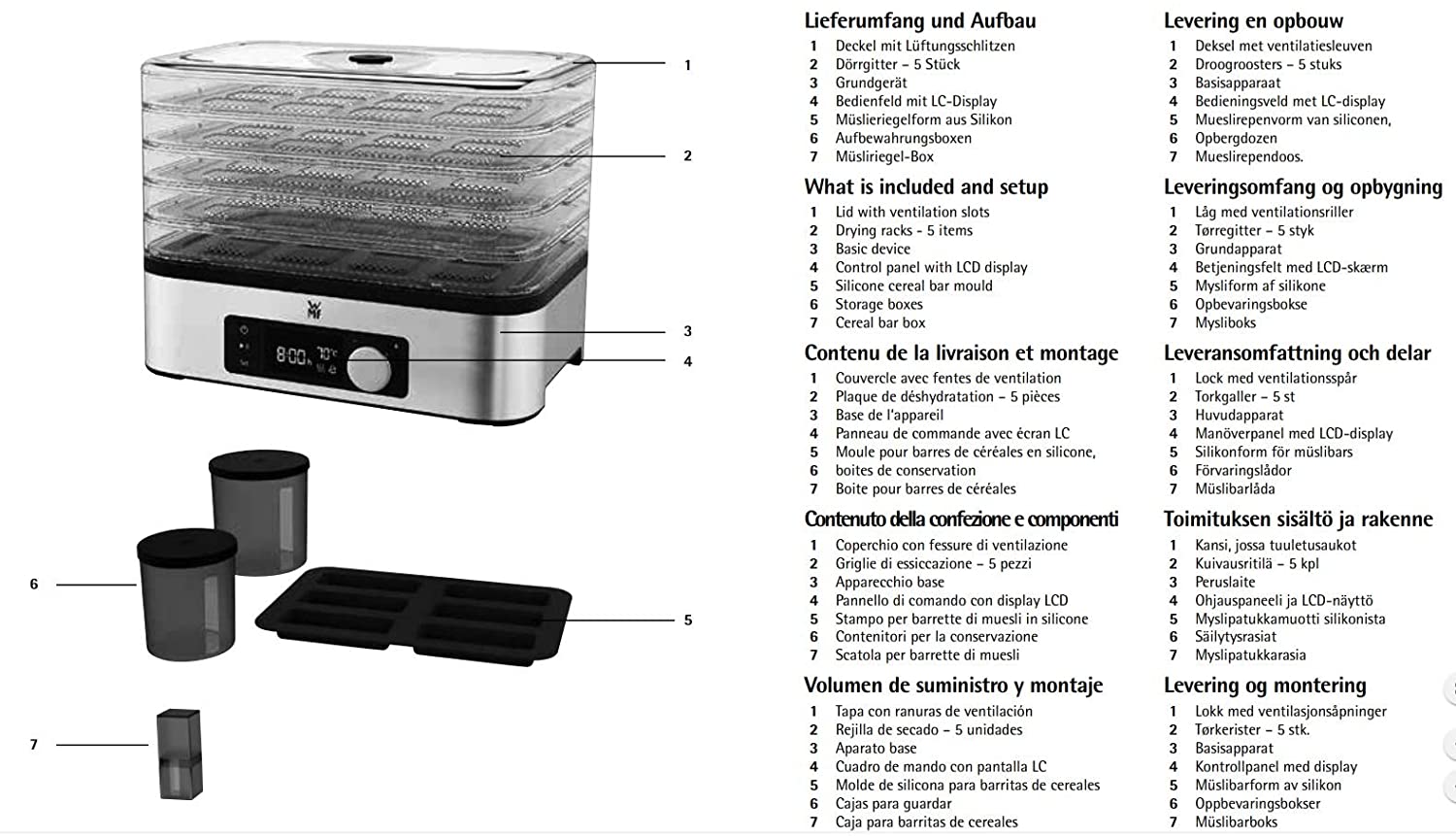 - Giá phơi bằng thép không gỉ, viền làm bằng Tritan không chứa BPA. Mô tả Sản phẩm Bạn có thể mua trái cây khô, nấm khô, thảo mộc, rau củ quả, thịt bò khô hoặc thanh muesli trong siêu thị với giá tiền khá tốt - hoặc bạn có thể đơn giản là tự làm. Thiết bị khử nước tự động cực kỳ tiết kiệm không gian và tiết kiệm năng lượng khử nước và làm khô mọi thứ có trên lưới điện hoặc trong khuôn silicone phụ - cũng chỉ qua đêm. Các món ăn nhẹ và thanh muesli thơm ngon được sản xuất gần như âm thầm trên năm tầng. Bảo vệ quá nhiệt với công tắc tự động ngắt đảm bảo an toàn cần thiết. Sáng hôm sau, bạn chỉ cần mang theo những món ngon nhỏ đi làm hoặc cho bọn trẻ ăn vặt. Ngoài ra còn có một bộ để đi thực tế với hai hộp lưu trữ và một hộp thanh muesli bổ sung. WMF giới thiệu thế hệ đầu tiên của WMF KITCHENminis. Dòng sản phẩm sấy thực phẩm WMF KITCHENminis làm bằng thép không gỉ Cromargan