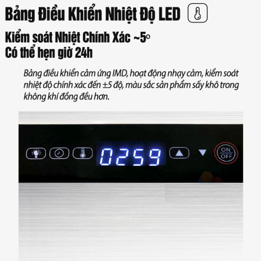 - Tích hợp đèn chiếu sáng, giúp quan sát quá trình sấy ban đêm dễ dàng