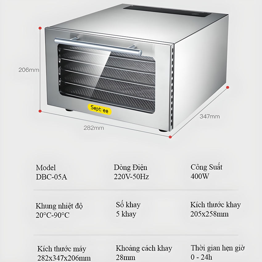 - Tất cả những thực phẩm có kích thước phù hợp đều sẽ là nguyên liệu lý tưởng của dòng máy sấy Septree DBC-05A. Không hề có sự kén chọn hay phân biệt thực phẩm được hoặc không được sấy, chỉ cần người dùng nắm bắt được nguyên lý hoạt động, điều chỉnh thời gian và nhiệt độ sấy thích hợp. Thông số kỹ thuật