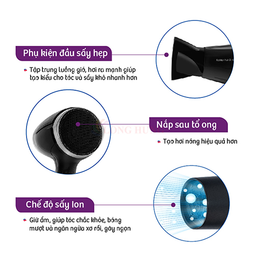 2 tốc độ, 4 chế độ sấy Chipset điều khiển nguồn điện để chống quá nhiệt, chống bỏng Làm khô tóc siêu nhanh, chỉ trong 2-3 phút Thiết kế sang trọng, kích thước gọn và