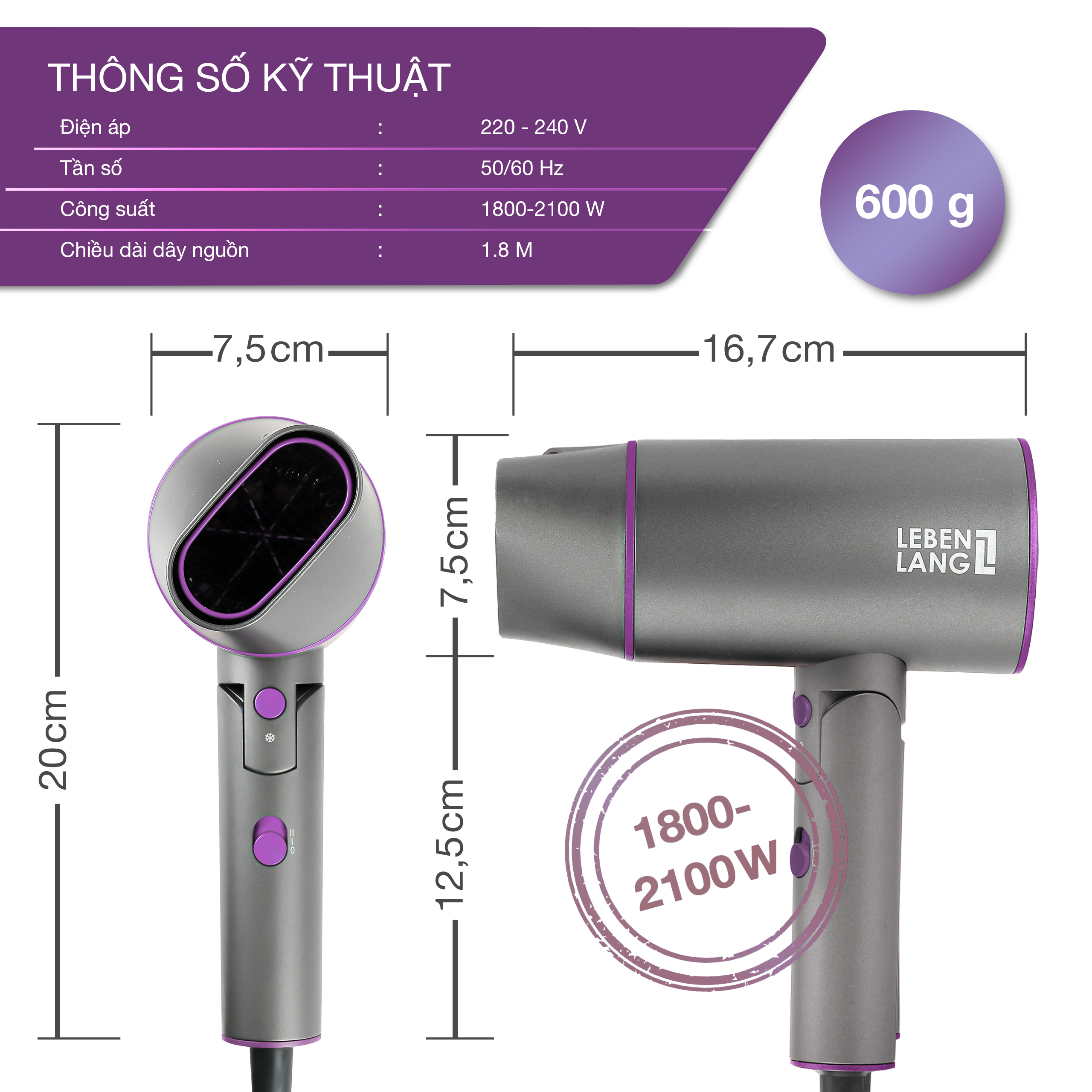 Máy sấy tóc Lebenlang 2 chiều nóng lạnh, gấp gọn tiện lợi, chống xơ rối tóc bằng công nghệ ion, 2100W