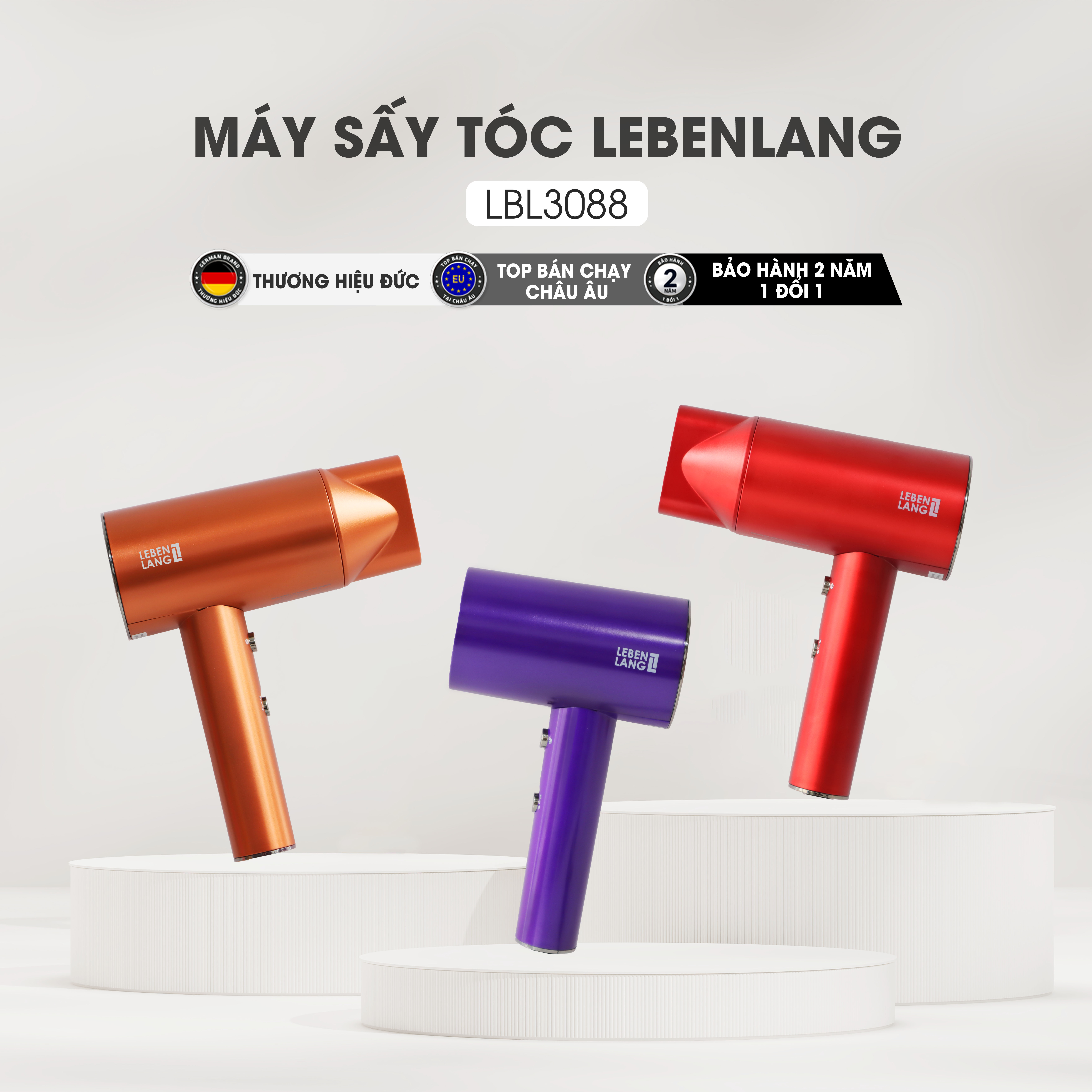 - Máy sấy tóc Lebenlang được thiết kế tinh xảo, sang trọng với 3 màu nổi bật: Cam, Tím, Đỏ; giúp khách hàng tùy chọn sắc màu theo sở thích của mình;