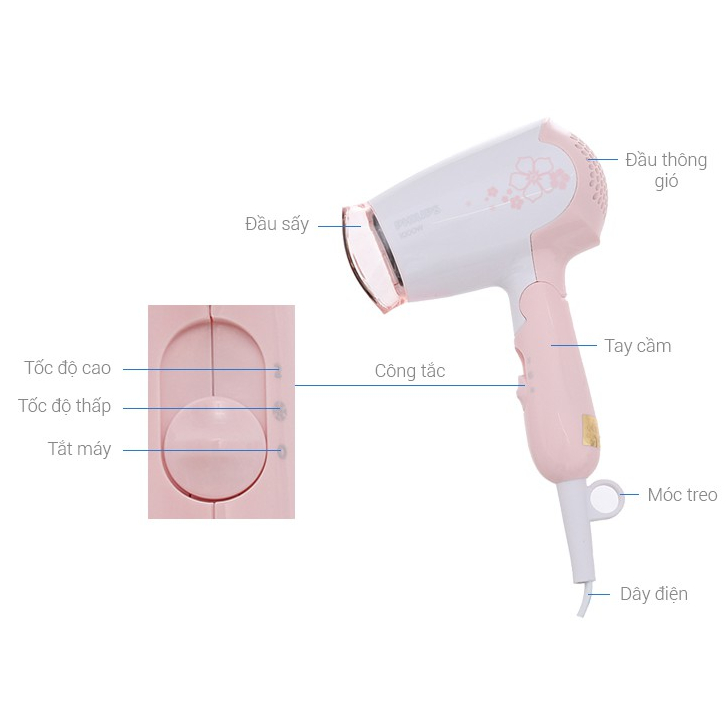 2 tốc độ, 4 chế độ sấy Chipset điều khiển nguồn điện để chống quá nhiệt, chống bỏng Làm khô tóc siêu nhanh, chỉ trong 2-3 phút Thiết kế sang trọng, kích thước gọn và