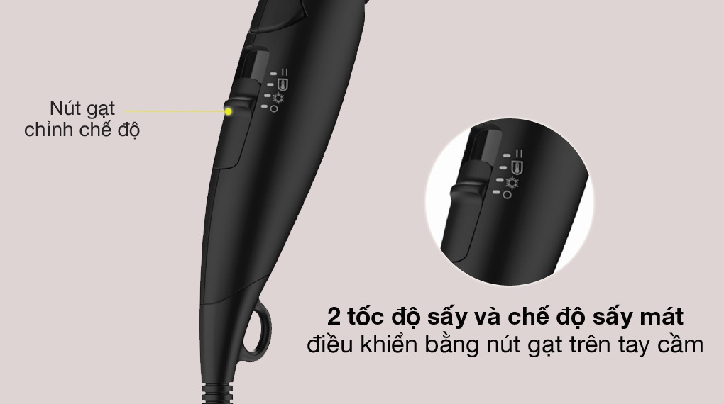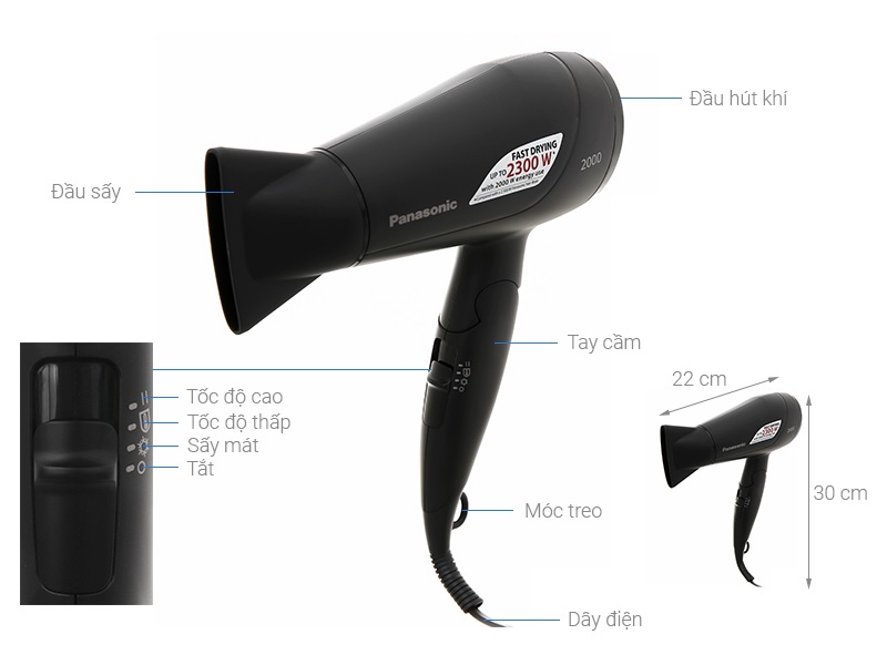 2 tốc độ, 4 chế độ sấy Chipset điều khiển nguồn điện để chống quá nhiệt, chống bỏng Làm khô tóc siêu nhanh, chỉ trong 2-3 phút Thiết kế sang trọng, kích thước gọn và