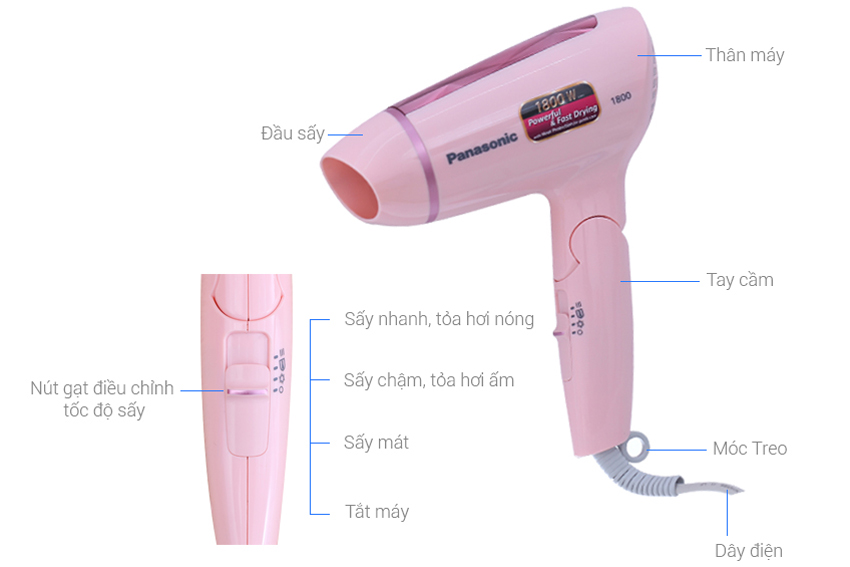 Máy sấy tóc Panasonic với thiết kế nhỏ gọn, dễ cầm nắm cùng công suất hoạt động mạnh mẽ 1800W giúp tóc nhanh khô, tiết kiệm thời gian sấy tóc Có 2 tốc độ