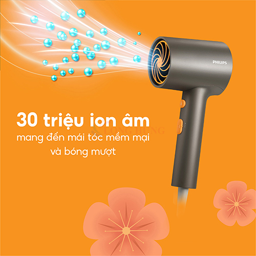 Kích cỡ nhỏ gọn, Tốc độ gió mạnh 30 triệu ion âm mang đến mái tóc mềm mại và bóng mượt Chăm sóc ion Công suất cao 1600 W để sấy khô nhanh Máy