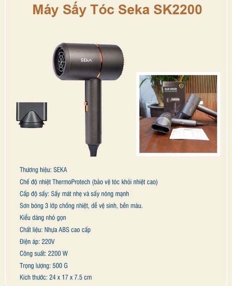 Mua tại TiktokMÁY SẤY TÓC SK2200 – CÔNG NGHỆ SẤY ION ÂM CAO CẤP, BÁN CHẠY NHẤT TẠI HÀN QUỐC Máy sấy tóc là sản phẩm không thể thiếu của mọi gia đình, hair salon và khách sạn,… Tuy nhiên, để chọn mua được một chiếc máy sấy tóc phù hợp, chất lượng tốt cũng không phải là điều dễ dàng. Trên thị trường hiện nay, có rất nhiều loại máy sấy tóc khác nhau, nhưng đa phần đều chỉ tập trung vào tính năng làm khô tóc mà không biết rằng rất nhiều chị em phụ nữ lo ngại máy sấy tóc gây hư tổn và xơ rối tóc do tác động của nhiệt. Nắm bắt được điều đó, SEKA đã cho ra đời dòng sản phẩm máy sấy tóc công nghệ Ion âm, làm nóng và cấp ẩm đồng thời giúp bảo vệ tóc khỏi tác động của nhiệt độ cao. Đặc biệt, mã sản phẩm Máy sấy tóc SK2200 là sản phẩm bán chạy nhất tại Hàn Quốc, được các nhà tạo mẫu tóc chuyên nghiệp và các Idol tin tưởng lựa chọn và dành rất nhiều lời khen. Vậy sản phẩm này có gì đặc biệt, hãy cùng khám phá ngay bên dưới nhé! THÔNG TIN KỸ THUẬT MÁY SẤY TÓC SK2200 SEKA