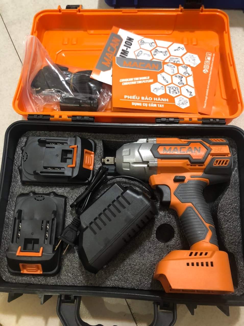 Phụ kiện bao gồm: 01 hộp máy, 01 thân máy, 02 pin 10cell, 01 sạc bàn pin tự ngắt khi đầy, 5 đầu khẩu, 1 đầu chuyển vít, 1 bộ chuyển khoan