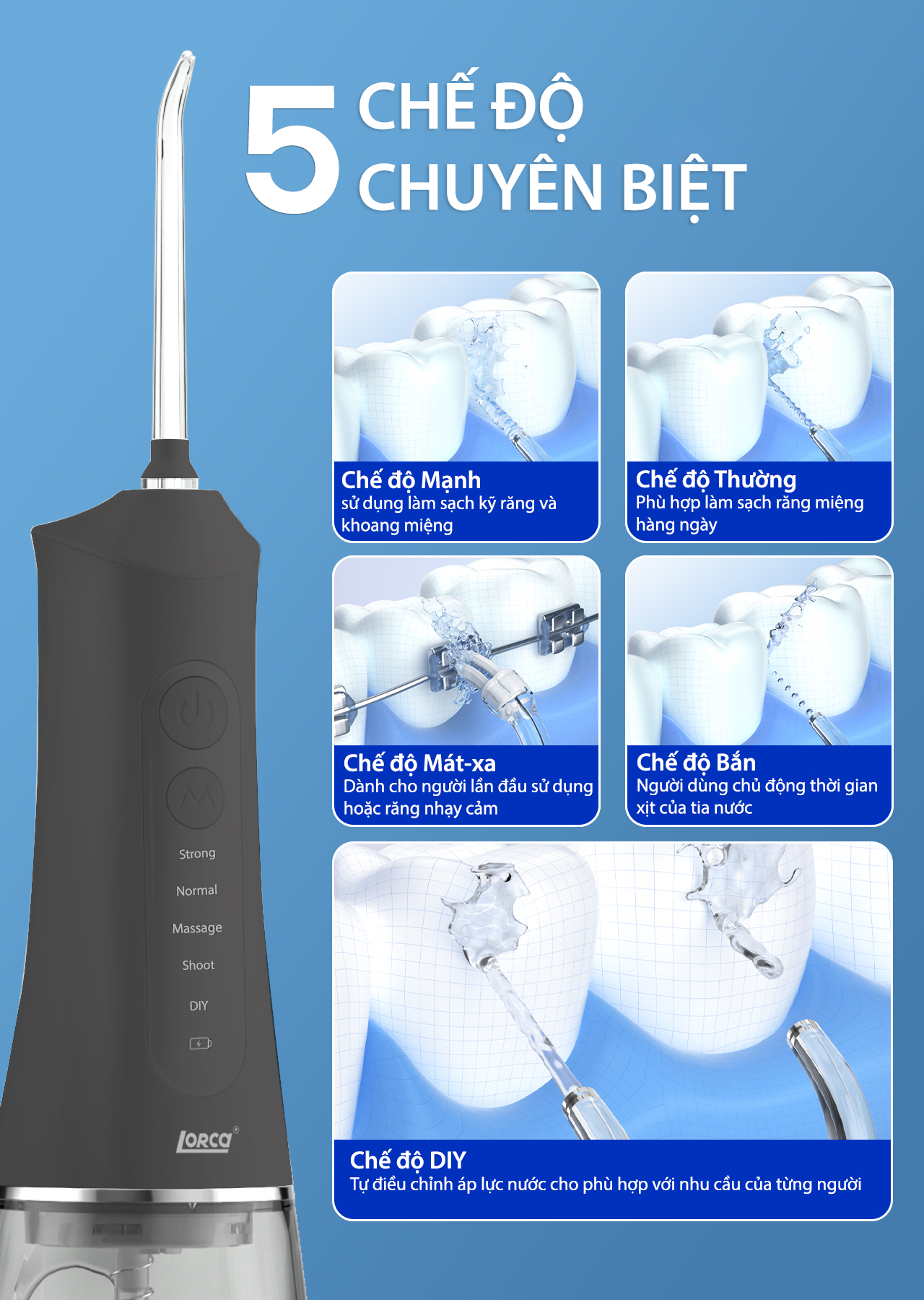 - 5 chế độ sử dụng đa dạng: Sản phẩm có 5 chế độ sử dụng khác nhau: Mạnh, Bình thường, Mát-xa, Bắn, DIY. Điều này mang đến nhiều lựa chọn chăm sóc răng miệng phù hợp với từng nhu cầu của người dùng.