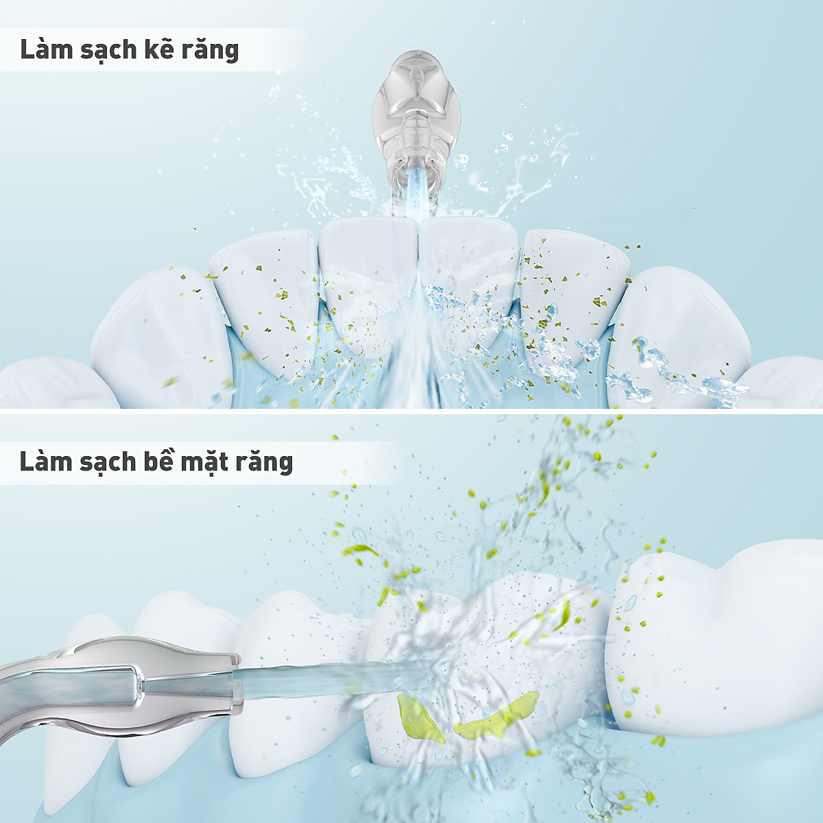 - Khi bọt nước vỡ ra, chúng sẽ tạo ra sóng xung kích tác động nhẹ lên nướu răng. Cùng với dòng nước, các bọt nước này giúp mảnh vụn thức ăn một cách cực kỳ hiệu quả thậm chí chỉ với cùng một mức áp lực nước. Làm sạch triệt để tất cả bề mặt răng Tia nước với công nghệ siêu âm giúp dễ dàng làm sạch bề mặt răng, kẽ răng, túi nha chu, chăm sóc nướu và chăm sóc dụng cụ chỉnh nha. Các tính năng tăng tính tiện dụng 3 phút sử dụng khi bình chứa nước đầy Bình chứa nước lớn 600 ml cho thời gian sử dụng dài (2 phút 10 giây sử dụng với đầu phun chỉnh nha.) Thời gian xấp xỉ. Khi sử dụng đầu phun siêu âm. Tay cầm nam châm Tay cầm lõi từ, kẹp giữ cáp giúp dễ dàng cất giữ. Khi cất giữ, phần dưới của tay cầm không chạm vào phần đáy nên luôn giữ được sạch sẽ. 10 mức áp lực nước tùy chọn Có thể điều chỉnh áp lực nước trong 10 nấc và cường độ dòng nước sử dụng lần cuối sẽ được thiết bị tự động ghi nhớ. Các tính năng tiện dụng khác Bình chứa có thể tháo rời Dễ dàng đổ đầy và bảo dưỡng, bình chứa có thể súc rửa được bằng máy. Chỉ riêng bình chứa, không tính các bộ phận khác của sản phẩm. Ổ cắm nguồn kép Hai khe để gài dây nguồn cho phép bạn rút dây từ cả hai bên trái và bên trái rất thuận tiện Tay cầm có thể rửa được Tay cầm có thể rửa bằng nước giúp dễ dàng bảo dưỡng. Thiết kế đơn giản và tinh tế Với thiết kế hình trụ đơn giản, màu trắng tạo cảm giác sạch sẽ và phù hợp với không gian xung quanh là nước. Thông số kỹ thuật Kích thước và trọng lượng Chiều cao: 285mm Chiều rộng: 125mm Chiều sâu; 140mm Trọng lượng: 995g