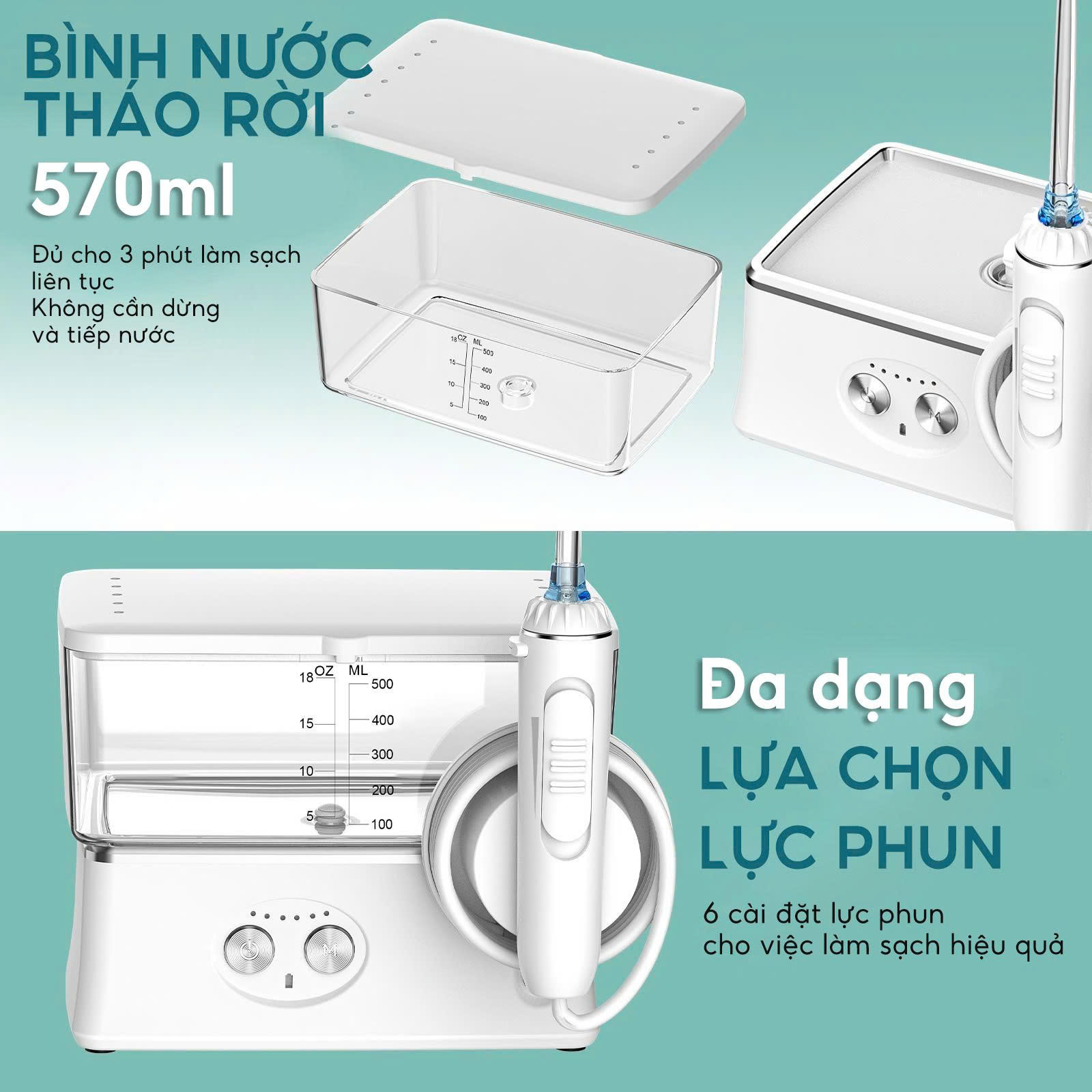 - Nước phun 1400 lần 1 phút với tia nước siêu âm, dễ dàng làm sạch mảng bám ở các kẽ răng