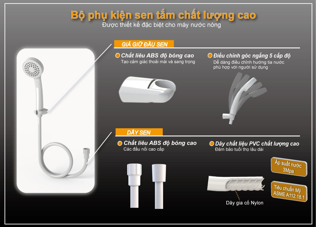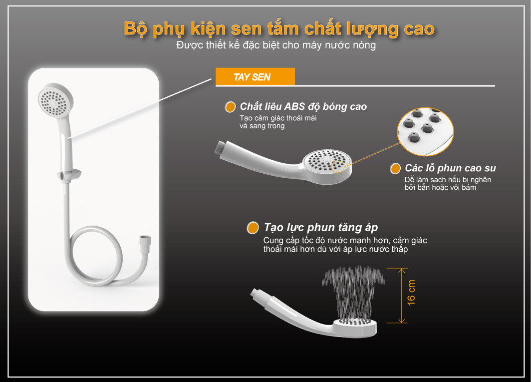 Sản phẩm cơ, bền và không lo độ ẩm: Toàn bộ hệ thống điều khiển là điều khiển cơ, không lo độ ẩm làm hư hỏng máy. Bơm 1 chiều DC, bơm khỏe, hoạt động êm ái, giúp tăng áp lực cho các nguồn nước có áp lực thấp Được trang bị chống giật RCD an toàn tuyệt đối: Công nghệ chống giật RCD an toàn tuyệt đối, không có mạch điện tử nên rất tin cậy Bầu đun lớn hơn, nhiều nước nóng hơn: Bầu đun được thiết kế lơn hơn, cho nước nóng nhiều hơn, đặc biệt không kén điện Sen tăng áp, tắm sảng khoái hơn: Sen tắm được thiết kế đặt biệt, giúp gia tăng áp lực dù áp đầu vào yếu, cho cảm giác tắm sảng khoái hơn Đạt cấp độ bảo vệ IP25 thật: Vỏ máy được thiết kế ôm sát phần thân sau, chống nước theo tiêu chuẩn IP 25 thật