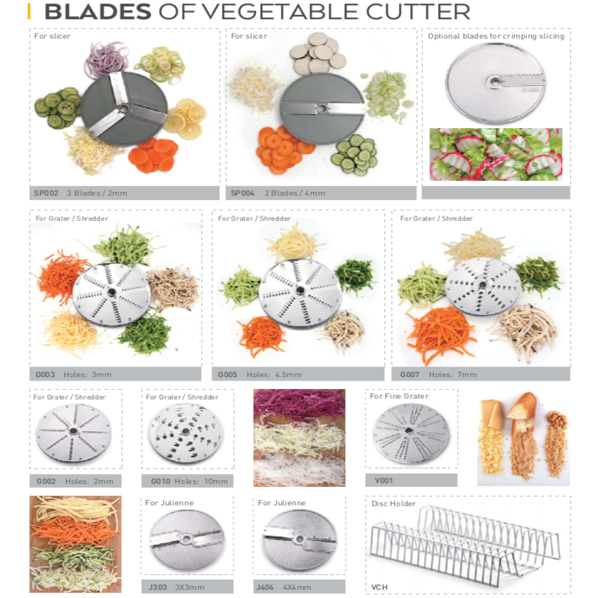- Máy cắt rau củ đa năng có kích thước 580245530mm và trọng lượng máy chỉ 26 kg, vừa không chiếm nhiều diện tích không gian lại vừa giúp di chuyển dễ dàng, thuận lợi sử dụng. Có thể đặt cố định trên bàn hoặc di chuyển khi cần. - Máy thái rau củ VC65MS được trang bị 5 bộ lưỡi dao với các chức năng khác nhau như: Thái lát dày-mỏng; thái sợi. Các lưỡi dao được chế tạo từ thép không gỉ cao cấp cho khả năng cắt rau củ tốt hơn các loại lưỡi dao thông thường.