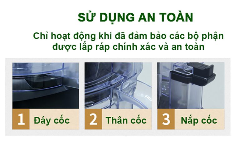Đặc biệt trên thân máy có chức năng khóa an toàn bảo vệ người dùng và tuổi thọ của máy. Trong trường hợp người dùng chưa lắp đặt đúng khớp nối thì máy sẽ không hoạt động.