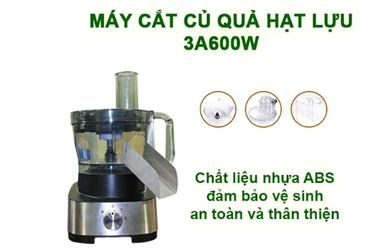 Máy thái rau củ quả đa năng 3A600W được thiết kế nhỏ gọn, sang trọng, trọng lượng chỉ 4Kg. Cốc xay được làm bằng nhựa cứng trong suốt, dày dặn, khả năng chịu tác động tốt, đảm bảo vệ sinh an toàn thực phẩm.
