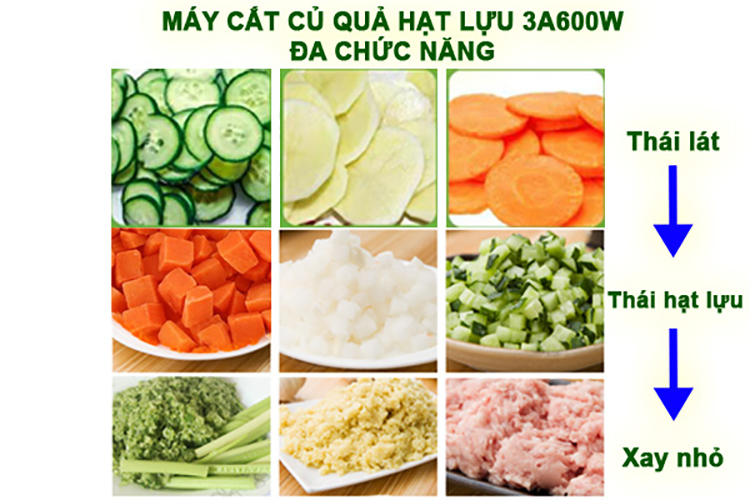 Nếu bạn đang tìm kiếm một chiếc máy thái rau củ quả đa chức năng, có thể thái hạt lựu, thái sợi, thái lát hay băm nhuyễn rau rủ thì sản phẩm Máy thái rau củ quả đa năng 3A600W là sự lựa chọn hàng đầu dành cho bạn.