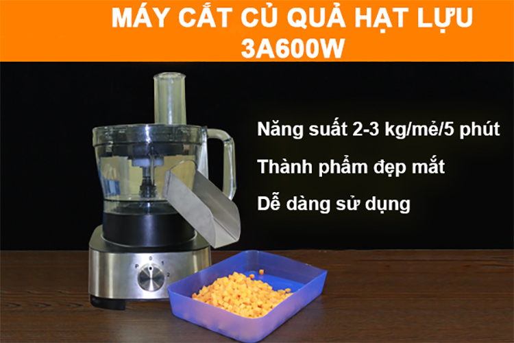 Máy thái rau củ quả đa năng 3A600W có năng suất thái rau củ quả đạt 2-5 kg/mẻ chỉ trong vòng 5 phút. Sản phẩm sẽ giúp các cơ sở chế biến thực phẩm nâng cao năng suất làm việc hiệu quả, tiết kiệm thời gian, công sức, và tăng tính thẩm mỹ cho món ăn.