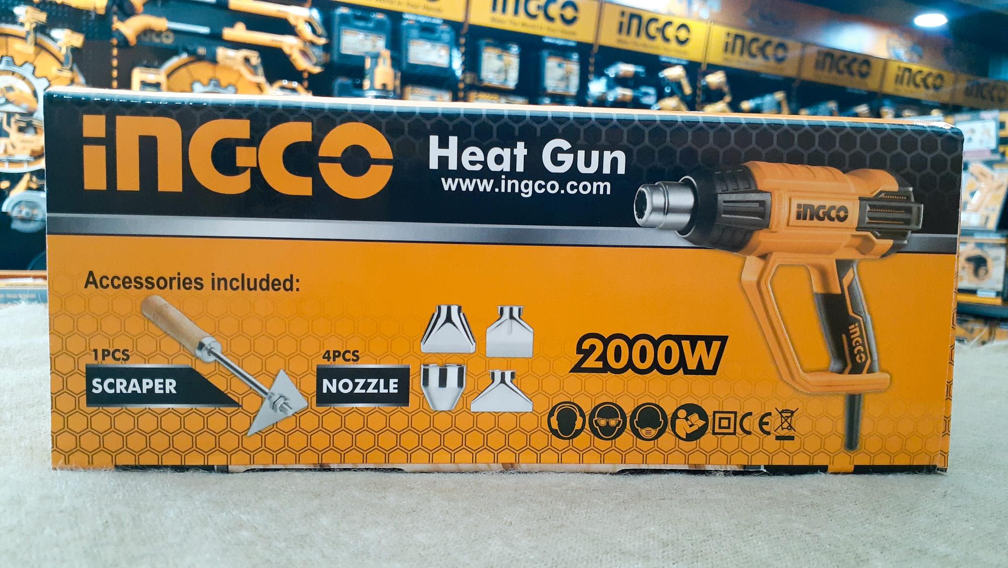 Máy thổi hơi nóng INGCO HG200028 được tặng kèm bộ phụ kiện như hình, mạnh mẽ với công suất 2000W, là 1 trong những máy thổi nhiệt chất lượng nhưng có mức giá rẻ, luôn nằm trong danh sách bán chạy. Ưu điểm của model này là được làm từ chất liệu nhựa ABS nên sở hữu độ rắn chắc cao, chịu nhiệt tốt, chống chịu được sự mài mòn trong suốt quá trình sử dụng, chống biến dạng khi bị tác động mạnh giúp bạn yên tâm sử dụng sản phẩm trong một thời gian dài mà không lo các vấn đề hư hỏng thường gặp như các loại máy thổi hơi nóng thông thường khác