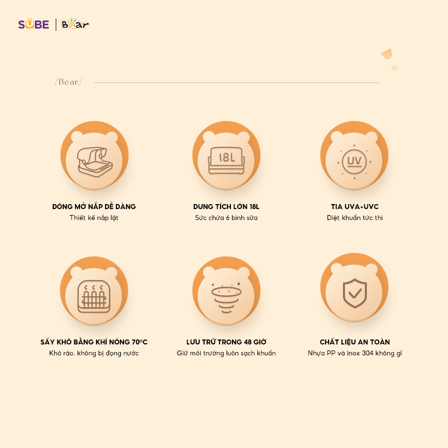 - Thiết kế 2 tầng rộng rãi, nắp cửa mở dễ dàng Thông số kỹ thuật – Màu sắc: Kem – Dung tích: 18L ± 0,5L – Công suất: 210W – Điện áp: 220V~50Hz – Phương thức tiệt trùng: UVC – Đèn UV: UVC – Tuổi thọ đèn UV: 60.000 giờ – Thời gian hoạt động của đèn UV: ≥10MN – Cường độ tia UV: 20µW/cm - 80µW/cm – Bước sóng của tia UV: 270 - 280 (nm) – Điều kiện sử dụng: Độ ẩm: 5% - 80%, Nhiệt độ: 5 độ C - 40 độ C – Khối lượng tịnh/ Tổng khối lượng: 2.4 Kg/ 3.1 Kg – Giới hạn khối lượng đồ dùng đặt trên kệ: 4 Kg ± 1 Kg – Chất liệu thân máy: Nhựa PP – Kích thước (L×W×H): 391x306x297mm – Bảo hành: 18 tháng Công dụng của Máy Tiệt Trùng 18L Bear SB-MTT20 – Tiệt trùng hoàn toàn: Thời gian hoạt động có thể cài đặt trong 10 - 20 phút. Tia UV kép UVA + UVC của máy có khả năng diệt khuẩn tức thì, tiệt trùng toàn diện lên đến 99.9%. Những tia UV có bước sóng 253.7 nm với thiết kế đặc biệt đảm bảo tiêu diệt các tác nhân gây hại một cách triệt để. – Sấy khô toàn diện: Máy sẽ sấy khô bằng khí nóng trong 40 phút và quạt gió lạnh trong 30 giây. Thời gian hoạt động có thể cài đặt trong 40 - 60 phút. Với khả năng sấy khô diện rộng bằng khí nóng ở nhiệt độ 70℃, máy đảm bảo các vật dụng sau khi tiệt trùng sẽ khô ráo hoàn toàn, không bị đọng nước, ngăn ngừa tình trạng vi khuẩn sinh sôi và phát triển. – Tự động tiệt trùng và sấy khô: 40 phút đầu tiên tiệt trùng bằng tia UV + sấy khô bằng không khí nóng và 10 phút tiếp theo sấy bằng không khí lạnh. Nếu thời gian hoạt động là 90 phút thì 80 phút đầu tiên là tiệt trùng trùng bằng tia UV + sấy khô bằng không khí nóng và 10 phút tiếp theo là sấy bằng không khí lạnh. Thời gian hoạt động có thể cài đặt trong 50 - 90 phút. – Lưu trữ trong thời gian dài: Sau mỗi 2 giờ, máy sẽ sấy khô trong 10 phút + 5 phút tiệt trùng bằng tia UV. Thời gian hoạt động là từ 2 - 48 giờ và có thể điều chỉnh. Máy có thể duy trì môi trường vô khuẩn sau khi sấy trong máy tới 48 giờ, mẹ hoàn toàn an tâm lưu trữ vật dụng trong máy sau khử trùng. Ưu điểm của Máy Tiệt Trùng 18L Bear SB-MTT20