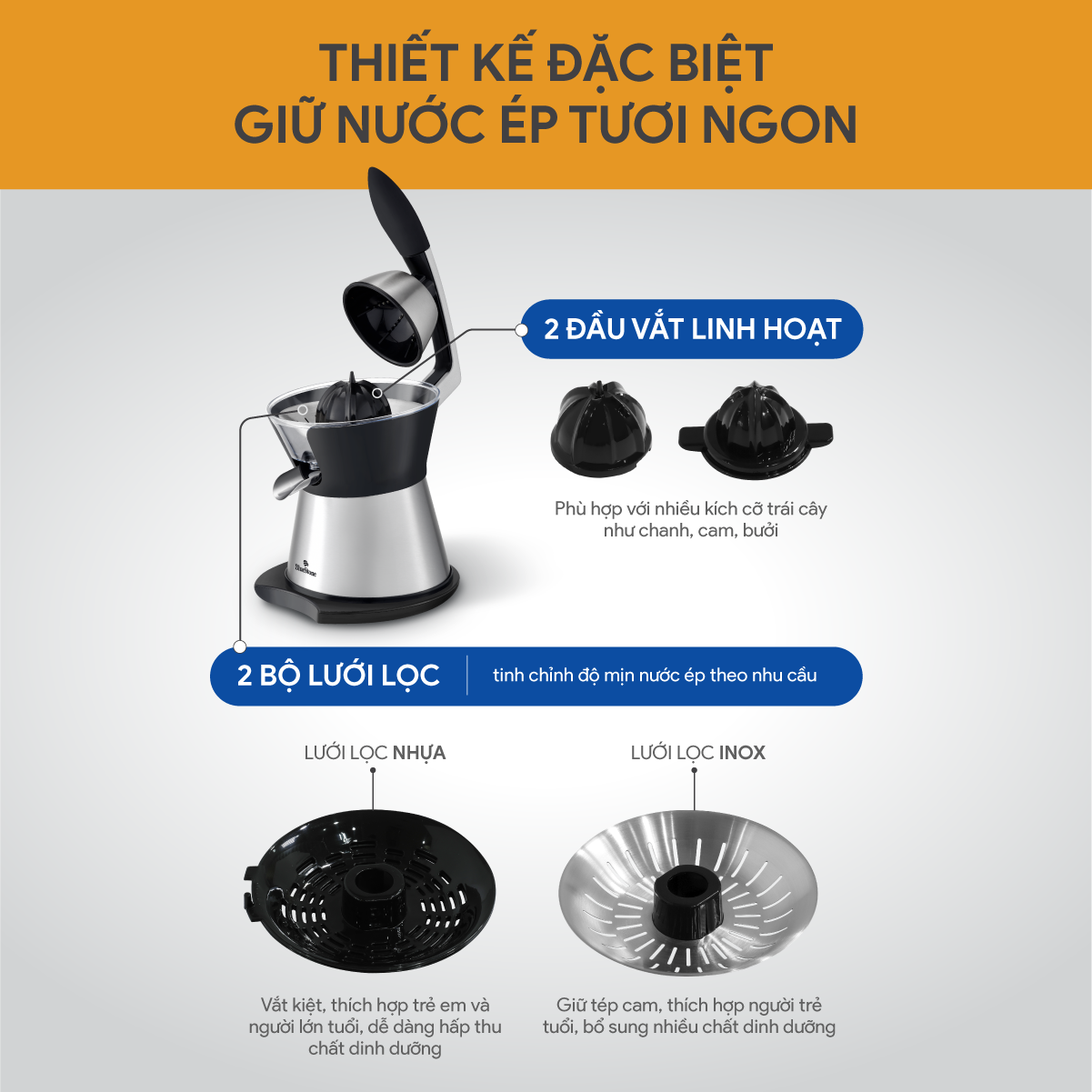 - Trang bị 2 bộ lọc: nhựa và inox, dễ dàng tùy chỉnh độ mịn của nước ép theo yêu cầu