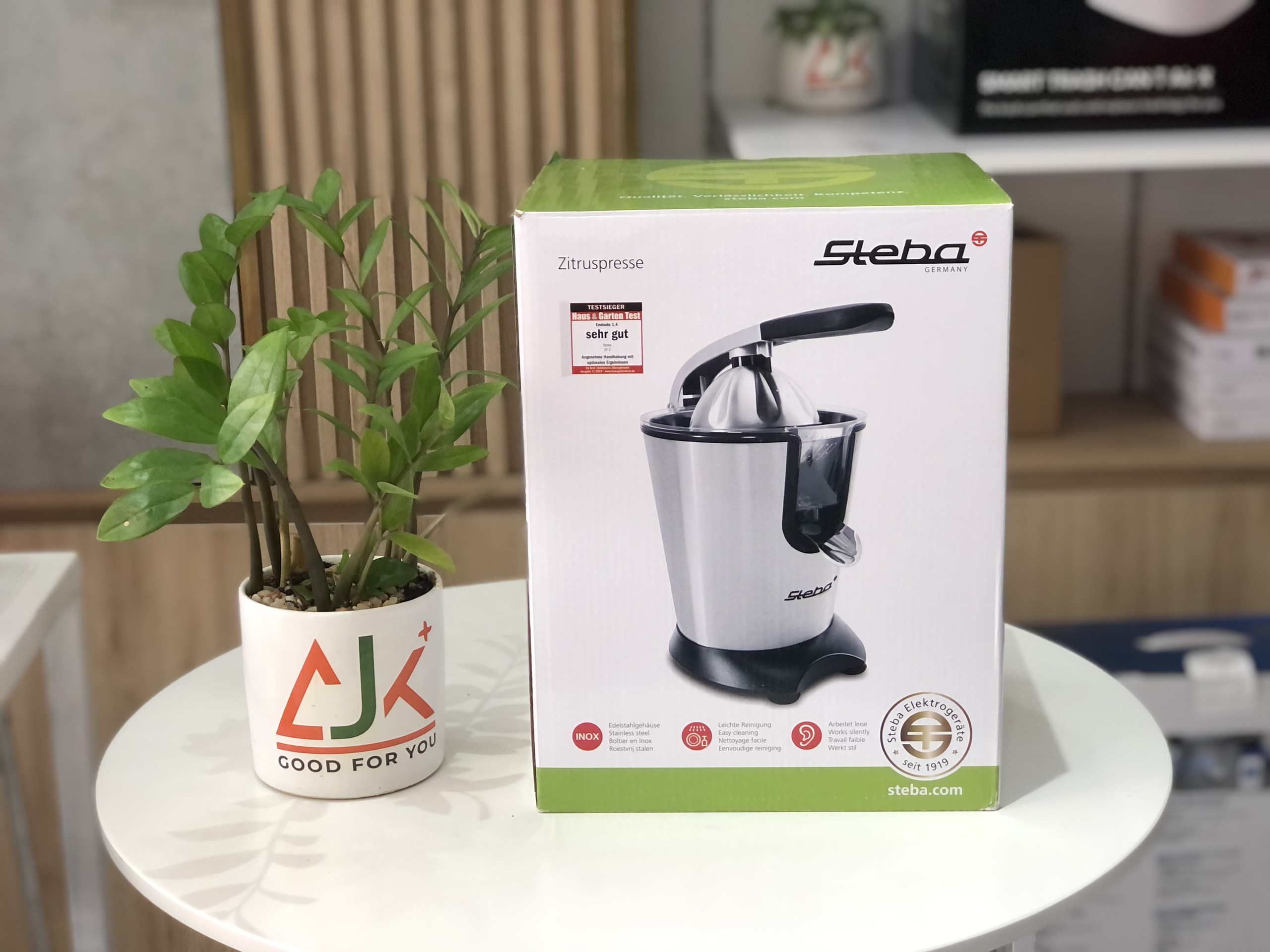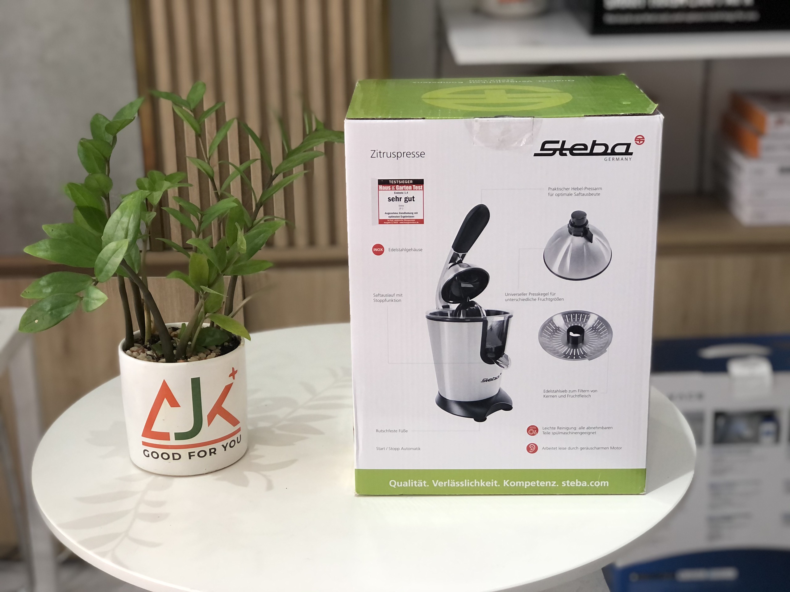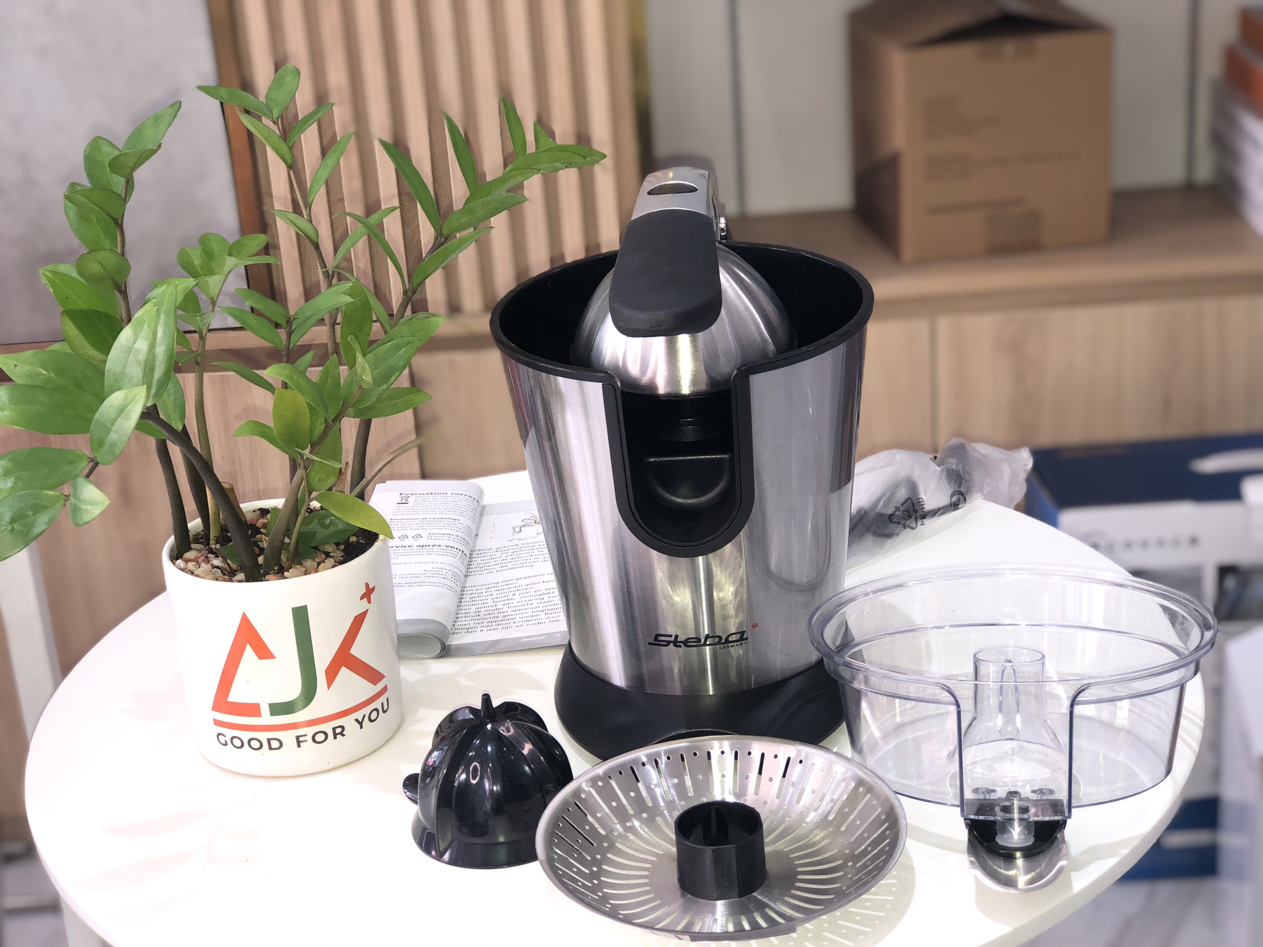 - Máy vắt cam Steba ZP2 có kiểu dáng nhỏ gọn, vỏ máy làm bằng chất liệu inox cao cấp rất bền, dễ chùi rửa và an toàn cho sức khỏe của người dùng. Chân đế chống trượt giúp máy vắt cam STEBA ZP2 vận hành được vững chắc hơ Ưu điểm của máy vắt cam Steba ZP2: