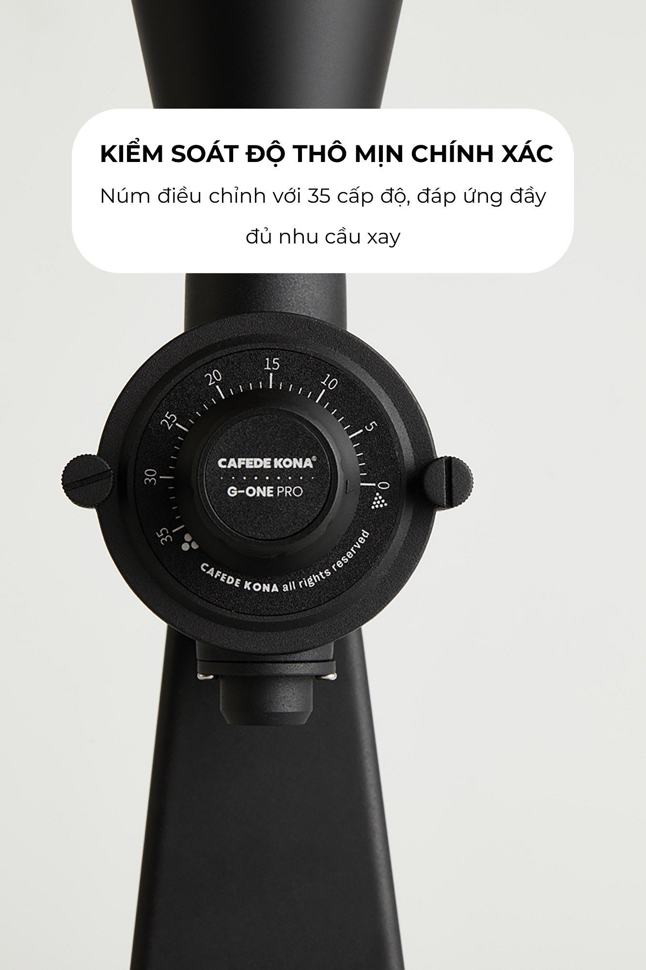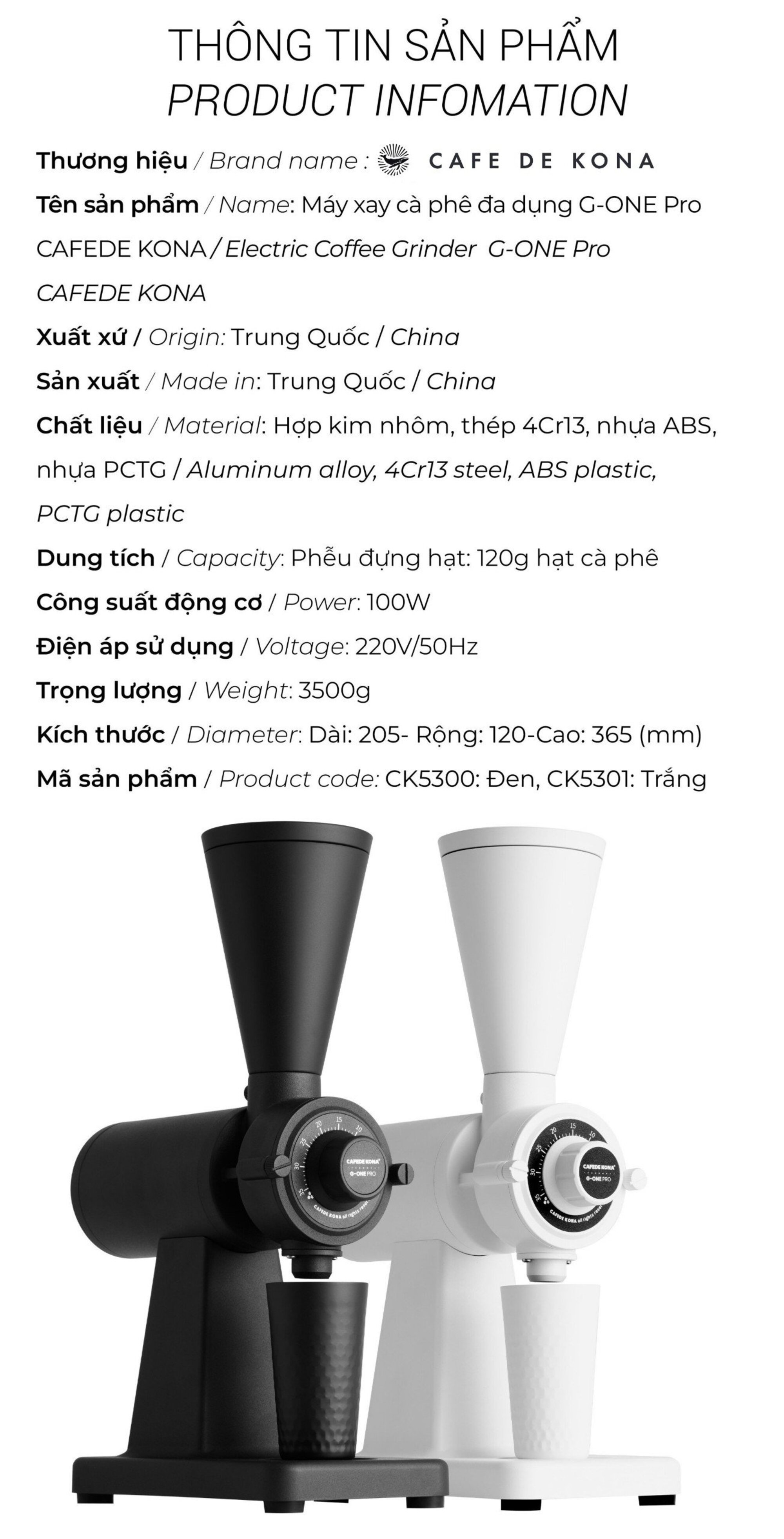 MÁY XAY CÀ PHÊ G-ONE PRO CAFE DE KONA    (Kèm ly đồng đựng cà phê sau khi xay)   Với thiết kế thanh mảnh nhỏ nhẹ hơn cả những dòng “mini” đang có trên thị trường nhiều. Diện tích chiếm chỗ không đáng kể khiến nó dễ dàng tìm được “chỗ đứng” cho mình ở mọi không gian pha chế.   Moto xay giảm tốc: Giúp cà phê không sinh nhiệt trong quá trình xay (Nhiệt làm hương vị cà phê bị ảnh hưởng tiêu cực).   Cực kỳ thích hợp với các quán cà phê Specialty hoặc các phòng lab coffee: Chất lượng bột cà phê đồng đều, sử dụng tốt cho quá trình cupping thử nếm và xay pha drip.   Dao xay 60mm dạng răng cưa với công nghệ khắc 3D: Chính xác hoàn hảo như nhau cho mỗi bộ dao xay xuất xưởng – và được mài sắc thêm sau khi khắc xong.   Dao xay bằng thép bão hòa Nito: Đem lại độ cứng rất cao lên tới 50 Rockwell – sẵn sàng nghiền mọi loại cà phê dù ở mức rang rất nhẹ hay cà phê chẳng may có lẫn sỏi vụn. Loại dao xay này rất khó chế tạo, nhưng 1 khi thành hình, chất lượng của nó được bảo tồn trong nhiều năm.   Đĩa xay trơn ít bám cà phê: Nghĩa là dù bạn chỉ xay thật ít cà phê cho bình Pour Over 1 người thôi thì cũng không sợ lãng phí cà phê trong máy xay. 15g cà phê đầu vào và bạn vẫn thu được ~15g cà phê đầu ra.   Dễ dàng vệ sinh: Bảo dưỡng và thay thế đĩa xay nếu có nhu cầu bởi linh kiện này hoàn toàn tháo rời được.   THÔNG SỐ KỸ THUẬT   Thương hiệu: Cafede Kona   Điện áp: 220v/50Hz   Công suất động cơ: 100W   Kích thước : 205mm x 120mm x 365mm   Công suất xay hạt: 350g/phút   Công suất phễu chứa : 120g cà phê hạt