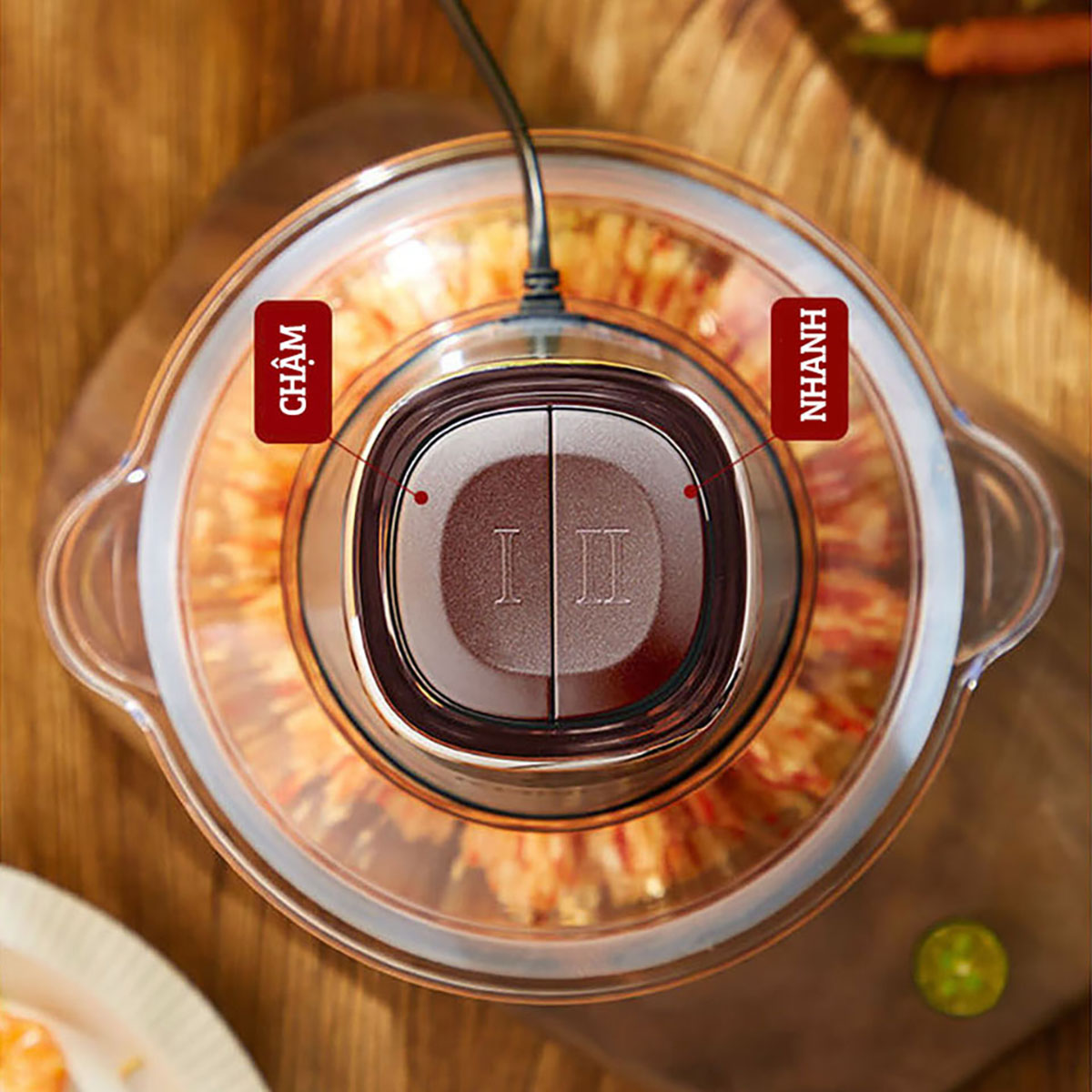 Máy có 2 tốc độ xay được tích hợp với 2 nút nhấn tiện dụng giúp bạn có thể dễ dàng điều chỉnh mức độ xay phù hợp với nhu cầu chế biến thực phẩm của bạn.