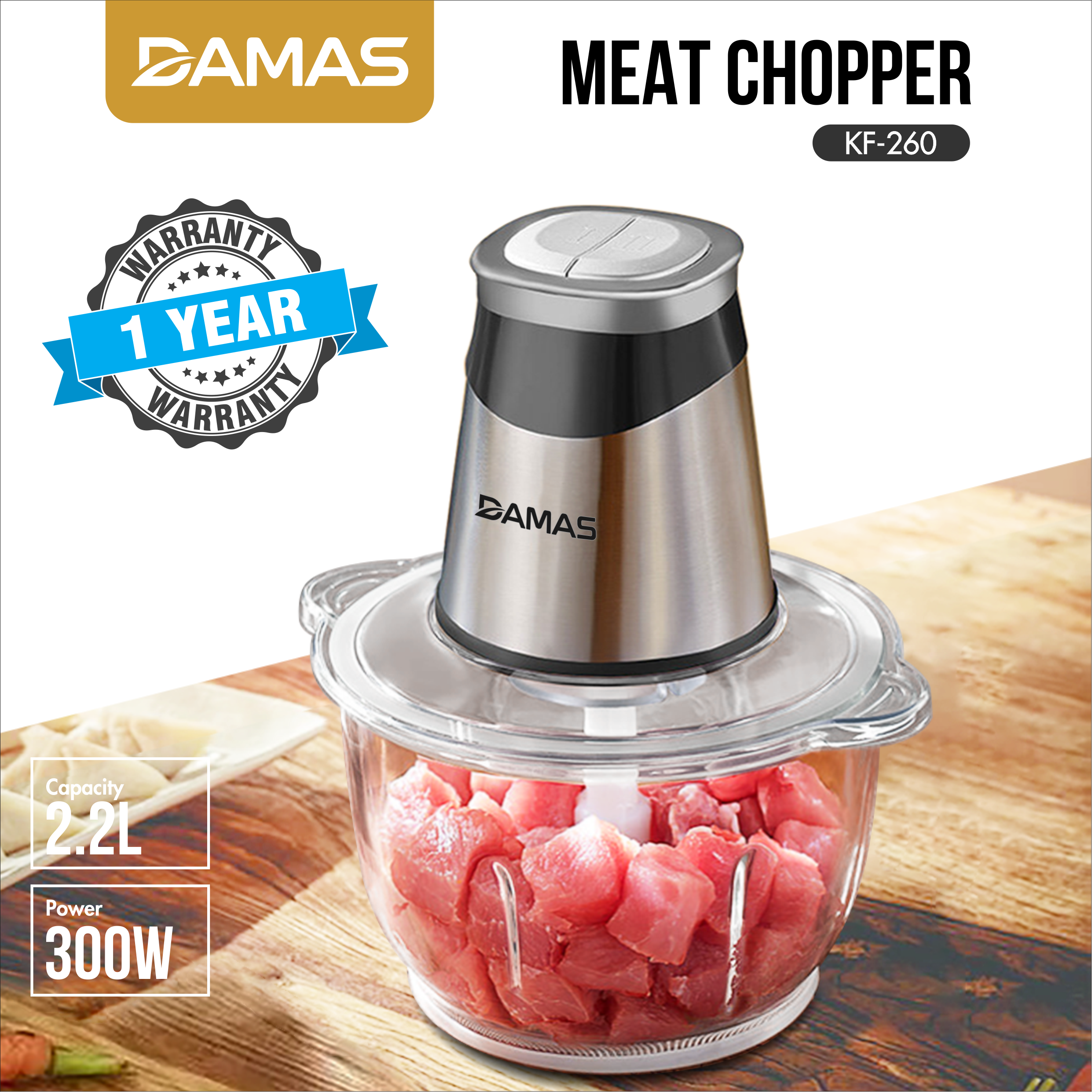 Với việc khảo sát của 2000 bà nội trợ cho thấy dung tích 1.8L - 2L là hơi nhỏ so với đại đa số gia đình, do đó sản phẩm máy xay thịt Damas KL-260 có dung tích 2.2L đã ra đời để đáp ứng nhu cầu của các bà nội trợ, cối xay có sức chứa tốt, lòng cối sâu, dùng để xay thịt và rau củ, đáp ứng tốt yêu cầu của người dùng.