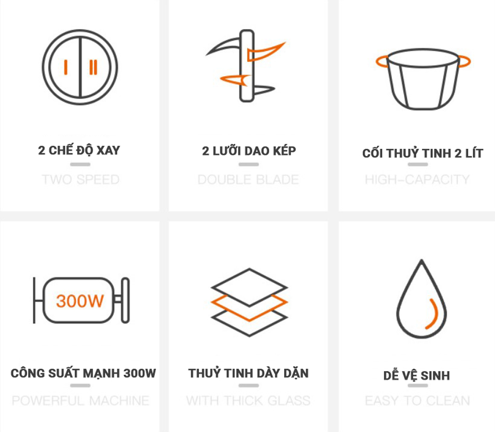 - Công suất: 450 W - Dung tích: 600 ml - Số cối xay: 3 - Công suất mạnh mẽ kết hợp lưỡi dao 4 cánh bằng thép không gỉ giúp xay nhuyễn thực phẩm