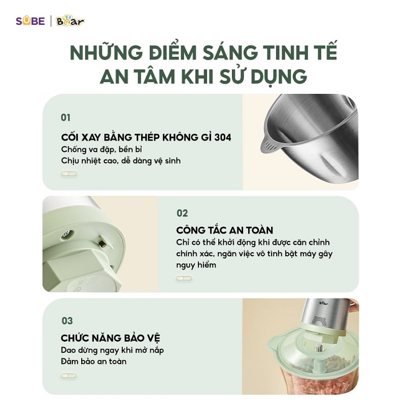 Tự tay chế biến, kiểm soát được toàn bộ quá trình sơ chế và xay thịt, giảm thiểu tối đa nguy cơ nhiễm khuẩn từ môi trường bên ngoài, Chất liệu inox không gỉ cao cấp