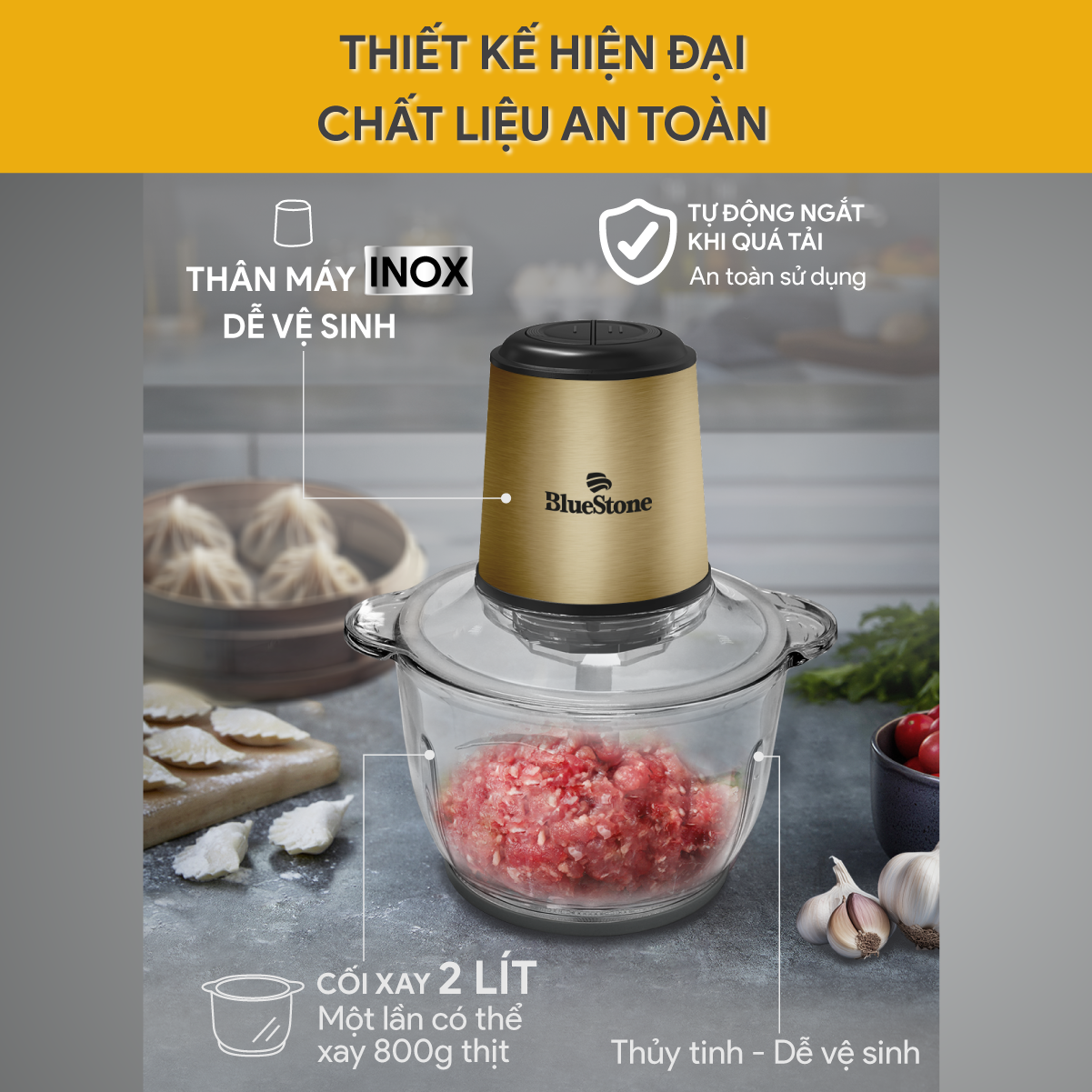 Mua tại TiktokMÁY XAY THỊT BLUESTONE CHB-5148 350W 2L Thịt xay luôn là món ăn hằng ngày, thân thuộc với mỗi gia đình Việt Nam, tuy nhiên thịt xay lại thường không rõ nguồn gốc, không đảm bảo đủ an toàn vệ sinh thực phẩm khi chế biến tại những cơ sở mua bán, từ đó nhu cầu sở hữu riêng tại nhà tăng cao. Máy xay thịt BlueStone CHB-5148 đáp ứng nhu cầu trên - Xay nhanh với công suất lớn, nhuyễn với 2 chế độ tùy chỉnh, an toàn, dễ vệ sinh, đảm bảo sức khỏe cả gia đình. THÔNG SỐ KỸ THUẬT