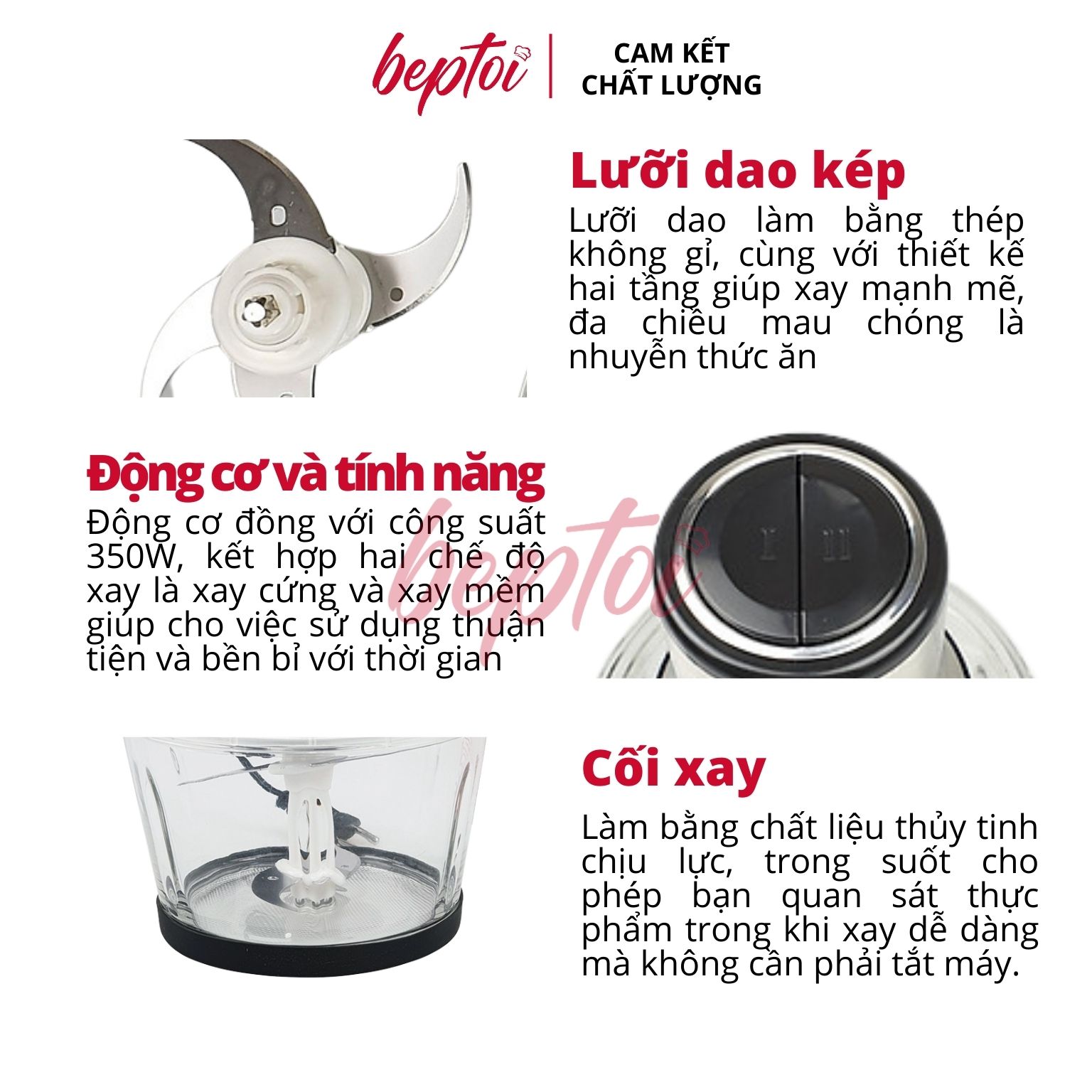 Công suất 200W hoạt động bằng một nút bấm đơn giản Lưỡi dao 2 cánh sắc bén bằng thép không gỉ Thiết kế nhỏ gọn, trọng lượng chỉ 1,63kg Cối thủy tinh dung tích 1L