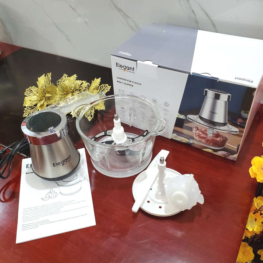 Mua tại TiktokMáy xay thịt đa năng Elegant FC-J08 công suất 350W, cối thủy tinh chuẩn Đức Thương hiệu: Elegant Thương hiệu xuất xứ: Đức Model: FC-J08 Code:4270002872219 Kích thước (cao x rộng x sâu): 32 x 22 x 19,5 cm Bảo hành: 12 tháng chính hãng bởi Nhà phân phối Elegant Việt Nam Chất liệu: Thủy tinh, Kim loại Loại máy nghiền thịt: Chạy Điện Dung tích cối xay: 1.8 lít Tiêu thụ điện năng: 350W Điện áp đầu vào: 220V - 50hz Trọng lượng thực: 2 kg Trọng lượng đóng gói: 2.4 kg Sản xuất tại: Trung Quốc Phụ kiện đi kèm gồm 3 lưỡi: 1 lưỡi dao xay thịt, rau củ + 1 đầu bóc vỏ tỏi + 1 đầu đánh trứng Đặc điểm nổi bật