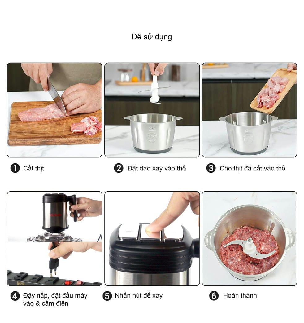 - Công suất 220V-50Hz/ 500W/ 1.2L - Xay được tất cả các loại thịt: bò, heo, tôm, cua, cá,ác loại hạt, đậu, trái cây, đồ khô mề - Nắp nhựa an toàn, lưỡi dao bằng