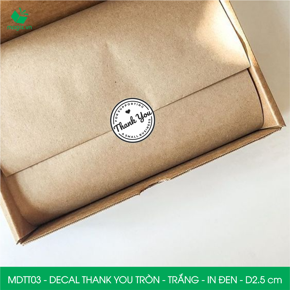 Decal - sticker Thank You là loại nhãn dán có nội dung "Cám ơn" được thiết kế theo hình tròn. Decal Thank You tròn thường được sử dụng để trang trí đóng gói thời trang, quà tặng… để thể hiện sự biết ơn, trân trọng tới người được nhận.   Sticker thank you tròn có nhiều đặc điểm nổi bật như: Kiểu dáng: Có nhiều thiết kế với nhiều hình ảnh, họa tiết hoặc chữ viết khác nhau, từ đơn giản đến cầu kỳ. Dễ dàng lựa chọn mẫu theo mục đích sử dụng. Kích thước: Đường kính: 2.5cm Chất liệu: Decal Thank You được làm từ giấy decal 3 lớp trên bề mặt được phủ thêm 1 lớp màng mờ, tăng khả năng chống thấm nước giúp decal bền hơn. Ngoài ra khi cán thêm lớp màng mờ sẽ giúp món quà trở lên sang trọng và bắt mắt hơn. Công dụng: Dán trên các gói hàng, quà tặng để thể hiện sự biết ơn đối với người nhận Dán trên các sản phẩm, dịch vụ để thể hiện sự trân trọng đối với khách hàng Dán trên các tài liệu, văn bản để thể hiện sự cảm ơn đối với người nhận Dán trên các vật dụng trang trí để tạo điểm nhấn   QUY CÁCH KỸ THUẬT Mã sản phẩm: MDTT Kiểu dáng: Hình tròn Đường kính: 2.5cm Đóng gói: 50 tem/ pack Kích thước đóng gói: 3x15cm Chất liệu: Decal 3 lớp - cán màng Màu sắc: Nhiều màu   LƯU Ý:  Bảo quản sản phẩm nơi khô ráo, sạch sẽ tránh tiếp xúc nơi có ánh sáng mặt trời và khu vực độ ẩm cao.