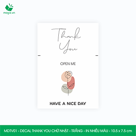 Decal - sticker Thank You là loại nhãn dán có nội dung "Cám ơn" được thiết kế theo hình chữ nhật. Decal Thank You thường được sử dụng để trang trí đóng gói thời trang,